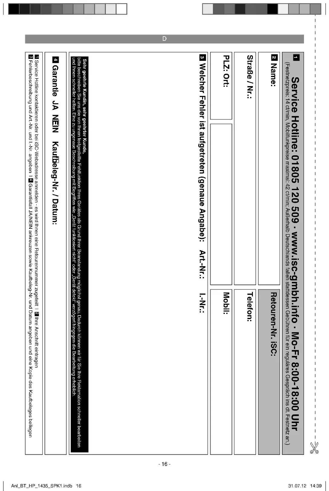 address shown below. Please enclose either the original or a copy of your sales receipt or ano- ther dated proof of purchase. Please keep your sales receipt in a safe place, as it is your proof of purchase. It would help us if you could describe the nature of the problem in as much detail as pos- sible. If the defect is covered by our guarantee then your device will either be repaired immediately and returned to you, or we will send you a new device. Of course, we are also happy off er a chargeable repair service for any defects which are not covered by the scope of this guarantee or for units which are no longer covered. To take advantage of this service, please send the device to our service address. Also refer to the restrictions of this warranty concerning wear parts/consumables and missing parts as set forth in the warranty conditions in these operating instructions. Anl_BT_HP_1435_SPK1.indb 25Anl_BT_HP_1435_SPK1.indb 25 31.07.12 14:4031.07.12 14:40F
