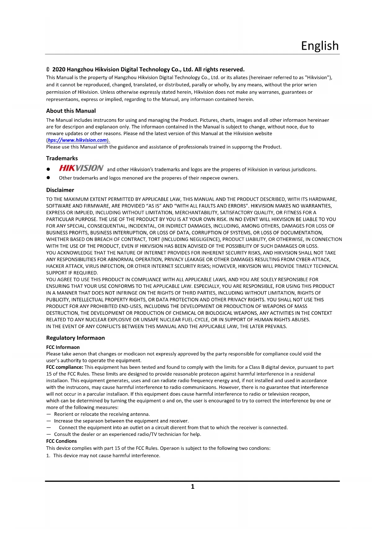 © 2020 Hangzhou Hikvision Digital Technology Co., Ltd. All rights reserved. This Manual is the property of Hangzhou Hikvision Digital Technology Co., Ltd. or its affiliates (hereinafter referred to as "Hikvision"), and it cannot be reproduced, changed, translated, or distributed, partially or wholly, by any means, without the prior written permission of Hikvision. Unless otherwise expressly stated herein, Hikvision does not make any warranties, guarantees or representations, express or implied, regarding to the Manual, any information contained herein. About this Manual The Manual includes instructions for using and managing the Product. Pictures, charts, images and all other information hereinafter are for description and explanation only. The information contained in the Manual is subject to change, without notice, due to firmware updates or other reasons. Please find the latest version of this Manual at the Hikvision website (https://www.hikvision.com). Please use this Manual with the guidance and assistance of professionals trained in supporting the Product. Trademarks and other Hikvision’s trademarks and logos are the properties of Hikvision in various jurisdictions. Other trademarks and logos mentioned are the properties of their respective owners. Disclaimer TO THE MAXIMUM EXTENT PERMITTED BY APPLICABLE LAW, THIS MANUAL AND THE PRODUCT DESCRIBED, WITH ITS HARDWARE, SOFTWARE AND FIRMWARE, ARE PROVIDED “AS IS” AND “WITH ALL FAULTS AND ERRORS”. HIKVISION MAKES NO WARRANTIES, EXPRESS OR IMPLIED, INCLUDING WITHOUT LIMITATION, MERCHANTABILITY, SATISFACTORY QUALITY, OR FITNESS FOR A PARTICULAR PURPOSE. THE USE OF THE PRODUCT BY YOU IS AT YOUR OWN RISK. IN NO EVENT WILL HIKVISION BE LIABLE TO YOU FOR ANY SPECIAL, CONSEQUENTIAL, INCIDENTAL, OR INDIRECT DAMAGES, INCLUDING, AMONG OTHERS, DAMAGES FOR LOSS OF BUSINESS PROFITS, BUSINESS INTERRUPTION, OR LOSS OF DATA, CORRUPTION OF SYSTEMS, OR LOSS OF DOCUMENTATION, WHETHER BASED ON BREACH OF CONTRACT, TORT (INCLUDING NEGLIGENCE), PRODUCT LIABILITY, OR OTHERWISE, IN CONNECTION WITH THE USE OF THE PRODUCT, EVEN IF HIKVISION HAS BEEN ADVISED OF THE POSSIBILITY OF SUCH DAMAGES OR LOSS. YOU ACKNOWLEDGE THAT THE NATURE OF INTERNET PROVIDES FOR INHERENT SECURITY RISKS, AND HIKVISION SHALL NOT TAKE ANY RESPONSIBILITIES FOR ABNORMAL OPERATION, PRIVACY LEAKAGE OR OTHER DAMAGES RESULTING FROM CYBER-ATTACK, HACKER ATTACK, VIRUS INFECTION, OR OTHER INTERNET SECURITY RISKS; HOWEVER, HIKVISION WILL PROVIDE TIMELY TECHNICAL SUPPORT IF REQUIRED. YOU AGREE TO USE THIS PRODUCT IN COMPLIANCE WITH ALL APPLICABLE LAWS, AND YOU ARE SOLELY RESPONSIBLE FOR ENSURING THAT YOUR USE CONFORMS TO THE APPLICABLE LAW. ESPECIALLY, YOU ARE RESPONSIBLE, FOR USING THIS PRODUCT IN A MANNER THAT DOES NOT INFRINGE ON THE RIGHTS OF THIRD PARTIES, INCLUDING WITHOUT LIMITATION, RIGHTS OF PUBLICITY, INTELLECTUAL PROPERTY RIGHTS, OR DATA PROTECTION AND OTHER PRIVACY RIGHTS. YOU SHALL NOT USE THIS PRODUCT FOR ANY PROHIBITED END-USES, INCLUDING THE DEVELOPMENT OR PRODUCTION OF WEAPONS OF MASS DESTRUCTION, THE DEVELOPMENT OR PRODUCTION OF CHEMICAL OR BIOLOGICAL WEAPONS, ANY ACTIVITIES IN THE CONTEXT RELATED TO ANY NUCLEAR EXPLOSIVE OR UNSAFE NUCLEAR FUEL-CYCLE, OR IN SUPPORT OF HUMAN RIGHTS ABUSES. IN THE EVENT OF ANY CONFLICTS BETWEEN THIS MANUAL AND THE APPLICABLE LAW, THE LATER PREVAILS. Regulatory Information FCC Information Please take attention that changes or modification not expressly approved by the party responsible for compliance could void the user’s authority to operate the equipment. FCC compliance: This equipment has been tested and found to comply with the limits for a Class B digital device, pursuant to part 15 of the FCC Rules. These limits are designed to provide reasonable protection against harmful interference in a residential installation. This equipment generates, uses and can radiate radio frequency energy and, if not installed and used in accordance with the instructions, may cause harmful interference to radio communications. However, there is no guarantee that interference will not occur in a particular installation. If this equipment does cause harmful interference to radio or television reception, which can be determined by turning the equipment off and on, the user is encouraged to try to correct the interference by one or more of the following measures: — Reorient or relocate the receiving antenna. — Increase the separation between the equipment and receiver. — Connect the equipment into an outlet on a circuit different from that to which the receiver is connected. — Consult the dealer or an experienced radio/TV technician for help. FCC Conditions This device complies with part 15 of the FCC Rules. Operation is subject to the following two conditions: 1. This device may not cause harmful interference.English