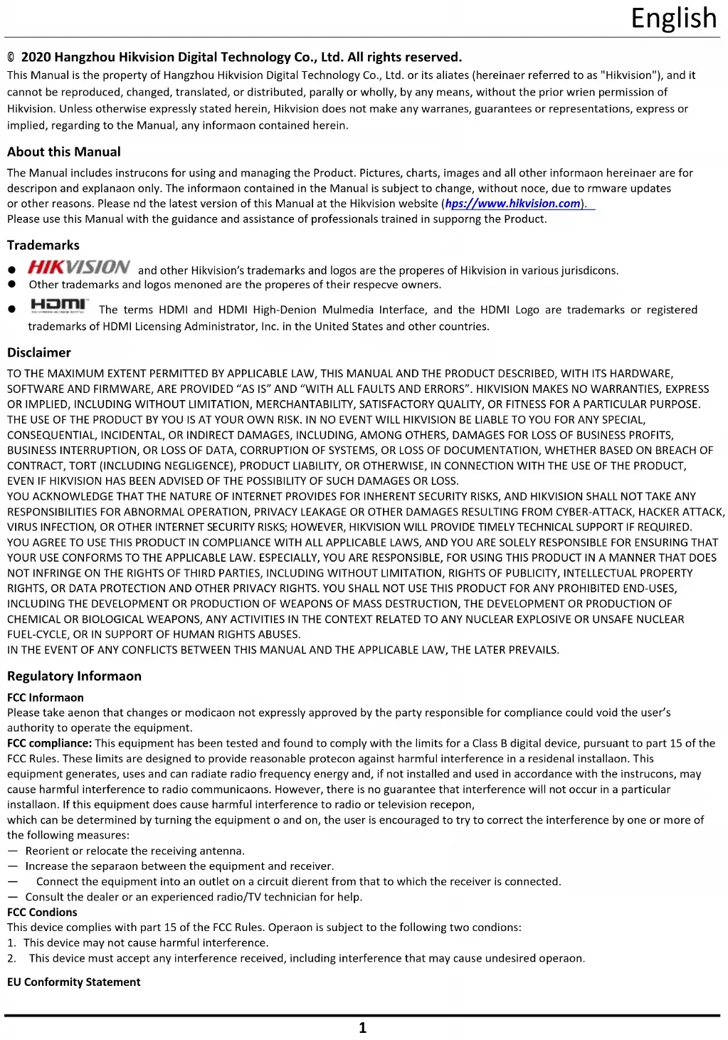 © 2020 Hangzhou Hikvision Digital Technology Co., Ltd. All rights reserved. This Manual is the property of Hangzhou Hikvision Digital Technology Co., Ltd. or its affiliates (hereinafter referred to as "Hikvision"), and it cannot be reproduced, changed, translated, or distributed, partially or wholly, by any means, without the prior written permission of Hikvision. Unless otherwise expressly stated herein, Hikvision does not make any warranties, guarantees or representations, express or implied, regarding to the Manual, any information contained herein. About this Manual The Manual includes instructions for using and managing the Product. Pictures, charts, images and all other information hereinafter are for description and explanation only. The information contained in the Manual is subject to change, without notice, due to firmware updates or other reasons. Please find the latest version of this Manual at the Hikvision website (https://www.hikvision.com). Please use this Manual with the guidance and assistance of professionals trained in supporting the Product. Trademarks and other Hikvision’s trademarks and logos are the properties of Hikvision in various jurisdictions. Other trademarks and logos mentioned are the properties of their respective owners. The terms HDMI and HDMI High-Definition Multimedia Interface, and the HDMI Logo are trademarks or registered trademarks of HDMI Licensing Administrator, Inc. in the United States and other countries. Disclaimer TO THE MAXIMUM EXTENT PERMITTED BY APPLICABLE LAW, THIS MANUAL AND THE PRODUCT DESCRIBED, WITH ITS HARDWARE, SOFTWARE AND FIRMWARE, ARE PROVIDED “AS IS” AND “WITH ALL FAULTS AND ERRORS”. HIKVISION MAKES NO WARRANTIES, EXPRESS OR IMPLIED, INCLUDING WITHOUT LIMITATION, MERCHANTABILITY, SATISFACTORY QUALITY, OR FITNESS FOR A PARTICULAR PURPOSE. THE USE OF THE PRODUCT BY YOU IS AT YOUR OWN RISK. IN NO EVENT WILL HIKVISION BE LIABLE TO YOU FOR ANY SPECIAL, CONSEQUENTIAL, INCIDENTAL, OR INDIRECT DAMAGES, INCLUDING, AMONG OTHERS, DAMAGES FOR LOSS OF BUSINESS PROFITS, BUSINESS INTERRUPTION, OR LOSS OF DATA, CORRUPTION OF SYSTEMS, OR LOSS OF DOCUMENTATION, WHETHER BASED ON BREACH OF CONTRACT, TORT (INCLUDING NEGLIGENCE), PRODUCT LIABILITY, OR OTHERWISE, IN CONNECTION WITH THE USE OF THE PRODUCT, EVEN IF HIKVISION HAS BEEN ADVISED OF THE POSSIBILITY OF SUCH DAMAGES OR LOSS. YOU ACKNOWLEDGE THAT THE NATURE OF INTERNET PROVIDES FOR INHERENT SECURITY RISKS, AND HIKVISION SHALL NOT TAKE ANY RESPONSIBILITIES FOR ABNORMAL OPERATION, PRIVACY LEAKAGE OR OTHER DAMAGES RESULTING FROM CYBER-ATTACK, HACKER ATTACK, VIRUS INFECTION, OR OTHER INTERNET SECURITY RISKS; HOWEVER, HIKVISION WILL PROVIDE TIMELY TECHNICAL SUPPORT IF REQUIRED. YOU AGREE TO USE THIS PRODUCT IN COMPLIANCE WITH ALL APPLICABLE LAWS, AND YOU ARE SOLELY RESPONSIBLE FOR ENSURING THAT YOUR USE CONFORMS TO THE APPLICABLE LAW. ESPECIALLY, YOU ARE RESPONSIBLE, FOR USING THIS PRODUCT IN A MANNER THAT DOES NOT INFRINGE ON THE RIGHTS OF THIRD PARTIES, INCLUDING WITHOUT LIMITATION, RIGHTS OF PUBLICITY, INTELLECTUAL PROPERTY RIGHTS, OR DATA PROTECTION AND OTHER PRIVACY RIGHTS. YOU SHALL NOT USE THIS PRODUCT FOR ANY PROHIBITED END-USES, INCLUDING THE DEVELOPMENT OR PRODUCTION OF WEAPONS OF MASS DESTRUCTION, THE DEVELOPMENT OR PRODUCTION OF CHEMICAL OR BIOLOGICAL WEAPONS, ANY ACTIVITIES IN THE CONTEXT RELATED TO ANY NUCLEAR EXPLOSIVE OR UNSAFE NUCLEAR FUEL-CYCLE, OR IN SUPPORT OF HUMAN RIGHTS ABUSES. IN THE EVENT OF ANY CONFLICTS BETWEEN THIS MANUAL AND THE APPLICABLE LAW, THE LATER PREVAILS. Regulatory Information FCC Information Please take attention that changes or modification not expressly approved by the party responsible for compliance could void the user’s authority to operate the equipment. FCC compliance: This equipment has been tested and found to comply with the limits for a Class B digital device, pursuant to part 15 of the FCC Rules. These limits are designed to provide reasonable protection against harmful interference in a residential installation. This equipment generates, uses and can radiate radio frequency energy and, if not installed and used in accordance with the instructions, may cause harmful interference to radio communications. However, there is no guarantee that interference will not occur in a particular installation. If this equipment does cause harmful interference to radio or television reception, which can be determined by turning the equipment off and on, the user is encouraged to try to correct the interference by one or more of the following measures: — Reorient or relocate the receiving antenna. — Increase the separation between the equipment and receiver. — Connect the equipment into an outlet on a circuit different from that to which the receiver is connected. — Consult the dealer or an experienced radio/TV technician for help. FCC Conditions This device complies with part 15 of the FCC Rules. Operation is subject to the following two conditions: 1. This device may not cause harmful interference.