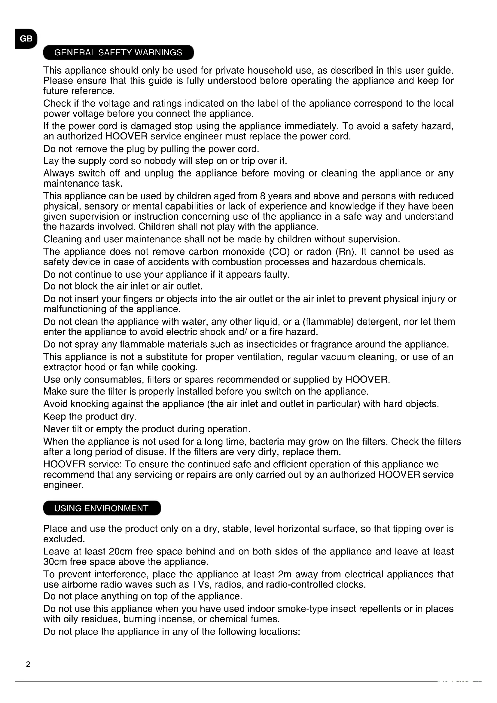 This appliance should only be used for private household use, as described in this user guide. Please ensure that this guide is fully understood before operating the appliance and keep for future reference. Check if the voltage and ratings indicated on the label of the appliance correspond to the local power voltage before you connect the appliance. If the power cord is damaged stop using the appliance immediately. To avoid a safety hazard, an authorized HOOVER service engineer must replace the power cord. Do not remove the plug by pulling the power cord. Lay the supply cord so nobody will step on or trip over it. Always switch off and unplug the appliance before moving or cleaning the appliance or any maintenance task. This appliance can be used by children aged from 8 years and above and persons with reduced physical, sensory or mental capabilities or lack of experience and knowledge if they have been given supervision or instruction concerning use of the appliance in a safe way and understand the hazards involved. Children shall not play with the appliance. Cleaning and user maintenance shall not be made by children without supervision. The appliance does not remove carbon monoxide (CO) or radon (Rn). It cannot be used as safety device in case of accidents with combustion processes and hazardous chemicals. Do not continue to use your appliance if it appears faulty. Do not block the air inlet or air outlet. Do not insert your ngers or objects into the air outlet or the air inlet to prevent physical injury or malfunctioning of the appliance. Do not clean the appliance with water, any other liquid, or a (ammable) detergent, nor let them enter the appliance to avoid electric shock and/ or a re hazard. Do not spray any ammable materials such as insecticides or fragrance around the appliance. This appliance is not a substitute for proper ventilation, regular vacuum cleaning, or use of an extractor hood or fan while cooking. Use only consumables, lters or spares recommended or supplied by HOOVER. Make sure the lter is properly installed before you switch on the appliance. Avoid knocking against the appliance (the air inlet and outlet in particular) with hard objects. Keep the product dry. Never tilt or empty the product during operation. When the appliance is not used for a long time, bacteria may grow on the lters. Check the lters after a long period of disuse. If the lters are very dirty, replace them. HOOVER service: To ensure the continued safe and efcient operation of this appliance we recommend that any servicing or repairs are only carried out by an authorized HOOVER service engineer. USING ENVIRONMENT Place and use the product only on a dry, stable, level horizontal surface, so that tipping over is excluded. Leave at least 20cm free space behind and on both sides of the appliance and leave at least 30cm free space above the appliance. To prevent interference, place the appliance at least 2m away from electrical appliances that use airborne radio waves such as TVs, radios, and radio-controlled clocks. Do not place anything on top of the appliance. Do not use this appliance when you have used indoor smoke-type insect repellents or in places with oily residues, burning incense, or chemical fumes. Do not place the appliance in any of the following locations:3