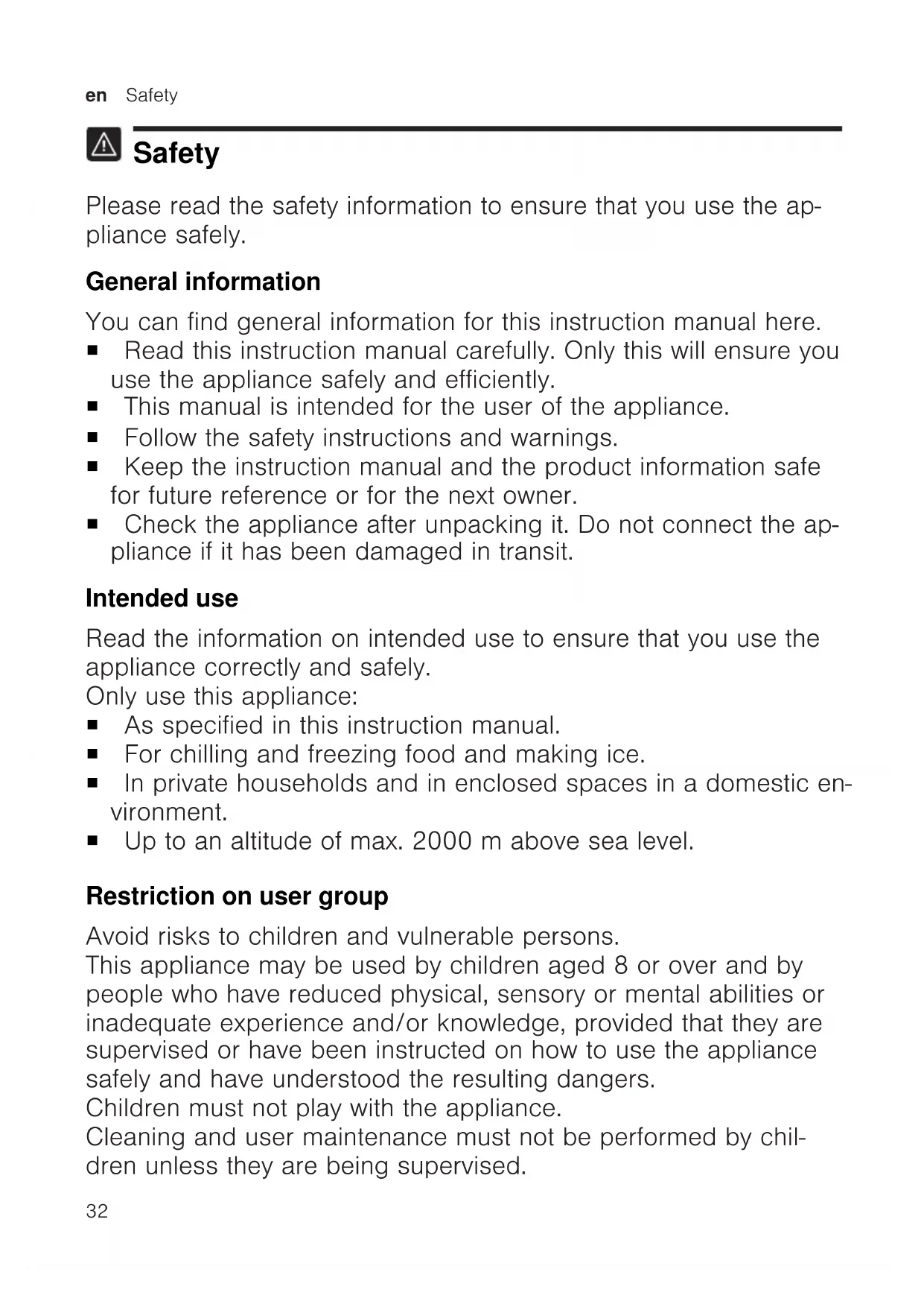 Safety Please read the safety information to ensure that you use the ap- pliance safely. General information You can find general information for this instruction manual here. ¡ Read this instruction manual carefully. Only this will ensure you use the appliance safely and efficiently. ¡ This manual is intended for the user of the appliance. ¡ Follow the safety instructions and warnings. ¡ Keep the instruction manual and the product information safe for future reference or for the next owner. ¡ Check the appliance after unpacking it. Do not connect the ap- pliance if it has been damaged in transit. Intended use Read the information on intended use to ensure that you use the appliance correctly and safely. Only use this appliance: ¡ As specified in this instruction manual. ¡ For chilling and freezing food and making ice. ¡ In private households and in enclosed spaces in a domestic en- vironment. ¡ Up to an altitude of max. 2000m above sea level. Restriction on user group Avoid risks to children and vulnerable persons. This appliance may be used by children aged 8 or over and by people who have reduced physical, sensory or mental abilities or inadequate experience and/or knowledge, provided that they are supervised or have been instructed on how to use the appliance safely and have understood the resulting dangers. Children must not play with the appliance. Cleaning and user maintenance must not be performed by chil- dren unless they are being supervised.Safety en