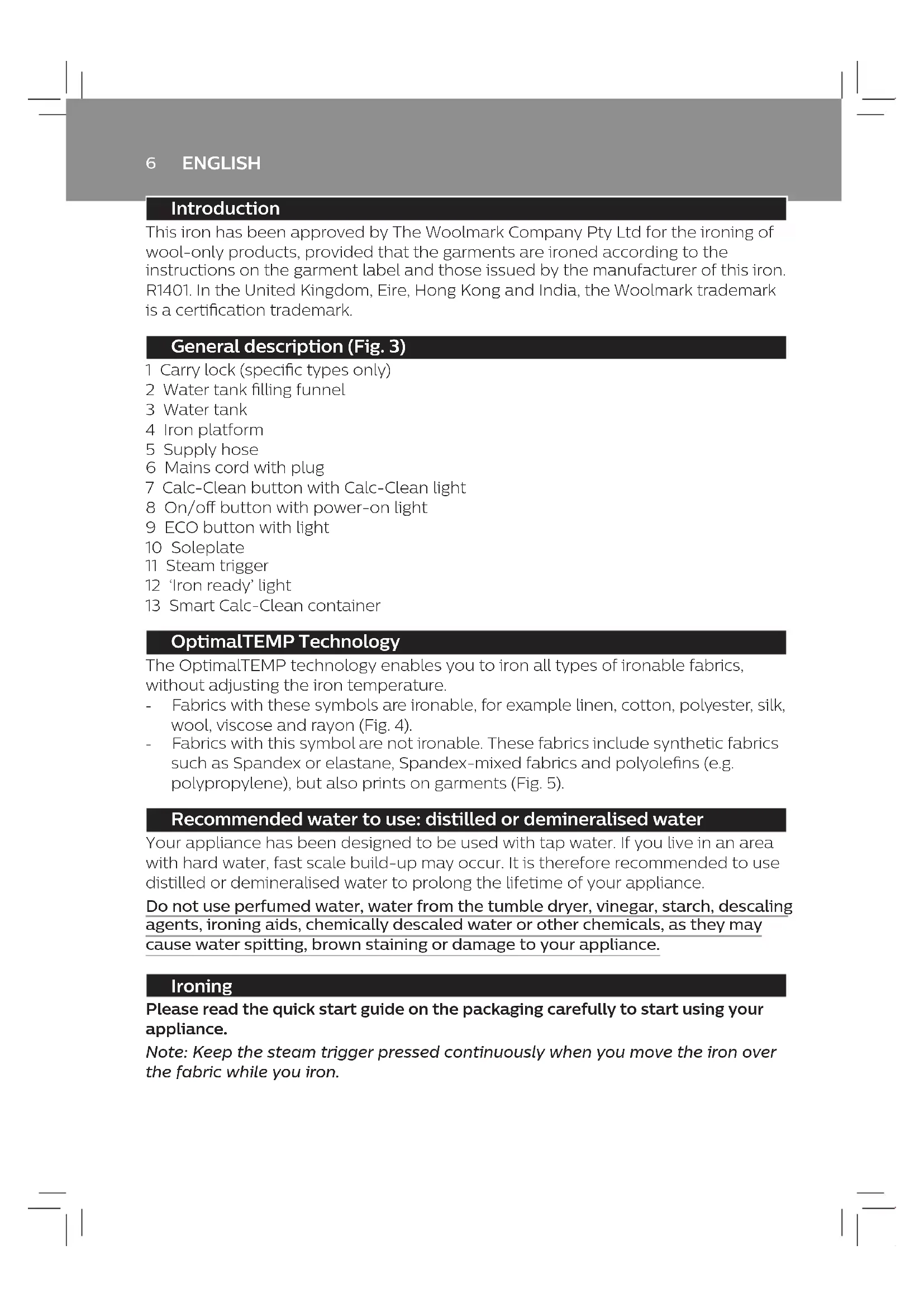 Introduction This iron has been approved by The Woolmark Company Pty Ltd for the ironing of wool-only products, provided that the garments are ironed according to the instructions on the garment label and those issued by the manufacturer of this iron. R1401. In the United Kingdom, Eire, Hong Kong and India, the Woolmark trademark is a certication trademark. General description (Fig. 3) 1 Carry lock (specic types only) 2 Water tank lling funnel 3 Water tank 4 Iron platform 5 Supply hose 6 Mains cord with plug 7 Calc-Clean button with Calc-Clean light 8 On/o button with power-on light 9 ECO button with light 10 Soleplate 11 Steam trigger 12 ‘Iron ready’ light 13 Smart Calc-Clean container OptimalTEMP Technology The OptimalTEMP technology enables you to iron all types of ironable fabrics, without adjusting the iron temperature. - Fabrics with these symbols are ironable, for example linen, cotton, polyester, silk, wool, viscose and rayon (Fig. 4). - Fabrics with this symbol are not ironable. These fabrics include synthetic fabrics such as Spandex or elastane, Spandex-mixed fabrics and polyolens (e.g. polypropylene), but also prints on garments (Fig. 5). Recommended water to use: distilled or demineralised water Your appliance has been designed to be used with tap water. If you live in an area with hard water, fast scale build-up may occur. It is therefore recommended to use distilled or demineralised water to prolong the lifetime of your appliance. Do not use perfumed water, water from the tumble dryer, vinegar, starch, descaling agents, ironing aids, chemically descaled water or other chemicals, as they may cause water spitting, brown staining or damage to your appliance. Ironing Please read the quick start guide on the packaging carefully to start using your appliance. Note: Keep the steam trigger pressed continuously when you move the iron over the fabric while you iron. ENGLISH7 IMPORTANT - Cleaning and maintenance Smart Calc-Clean System Your appliance has been designed with a Smart Calc-Clean system to ensure that descaling and cleaning is done regularly. This helps to maintain a strong steam performance and avoids dirt and stains coming out of the soleplate over time. To ensure that the cleaning process is performed, the steam generator gives regular reminders. Besides that, a second defence step to protect the steam generator from scale is integrated: the steam function gets disabled if descaling is not done after 1 hour steam ironing once the reminder came up. After descaling is done, the steam function will be restored. This takes place regardless of the type of water used. Sound and light Calc-Clean reminder - After 1 to 3 months of use, the light of the Calc-Clean button starts ashing and the appliance starts beeping to indicate that you have to perform the Calc-Clean process (Fig. 6). - You can continue steam ironing for 1 hour while the Calc-Clean light ashes and the appliance beeps. After 1 hour, the steam function is automatically disabled. You have to perform the Calc-Clean process before you can continue steam ironing. (Fig. 7) Performing the Calc-Clean process with the Calc-Clean container Do not leave the appliance unattended during the Calc-Clean process. Caution: Do not interrupt the process by lifting the iron up from the Calc-Clean container, as hot water and steam will come out of the soleplate. 1 Fill up the water tank halfway (Fig. 8). 2 Make sure that the appliance is plugged in and switched ON during the Calc-Clean process (Fig. 9). 3 Place the Calc-Clean container on the ironing board or any other even, stable surface (Fig. 10). 4 Place the iron stably on the Calc-Clean container. 5 Press and hold the Calc-Clean button for 2 seconds until you hear short beeps (Fig. 11). Note: The Calc-Clean container has been designed to collect scale particles and hot water during the Calc-Clean process. It is perfectly safe to rest the iron on this container during the entire process. 6 During the Calc-Clean process, you hear short beeps and a pumping sound. Wait approximately 2 minutes for the appliance to complete the process (Fig. 12). 7 When the Calc-Clean process is completed, the iron stops beeping (Fig. 13). 8 Wipe the iron with a piece of cloth and put it back on the base station (Fig. 14). 9 As the Calc-Clean container becomes hot during the Calc-Clean process, wait approx. 5 minutes before you touch it. 10 Carry the Calc-Clean container to the sink, empty it and store it for future use (Fig. 15). ENGLISH8 11 If necessary, you can repeat steps 1 to 10. Make sure that you empty the Calc-Clean container before you start the Calc-Clean process. Note: During the Calc-Clean process, clean water may come out of the soleplate if no scale has accumulated inside the iron. This is normal. Energy saving Eco mode By using the ECO mode (reduced amount of steam), you can save energy without compromising on the ironing result. 1 To activate the ECO mode, press the ECO button. The green ECO light goes on. (Fig. 16) 2 To deactivate the ECO mode, press the ECO button again. The green light goes