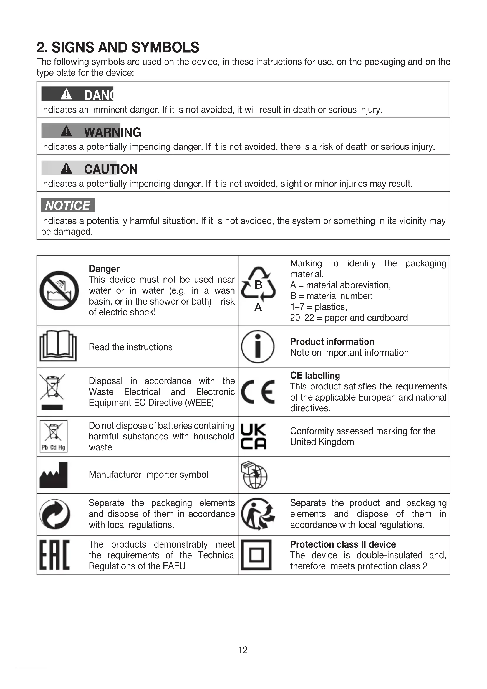 The following symbols are used on the device, in these instructions for use, on the packaging and on the type plate for the device: DANGER Indicates an imminent danger If it is not avoided, it will result in death or serious injury WARNING Indicates a potentially impending danger If it is not avoided, there is a risk of death or serious injury CAUTION Indicates a potentially impending danger If it is not avoided, slight or minor injuries may result NOTICE Indicates a potentially harmful situation If it is not avoided, the system or something in its vicinity may be damaged Danger This device must not be used near water or in water (eg in a wash basin, or in the shower or bath) – risk of electric shock!