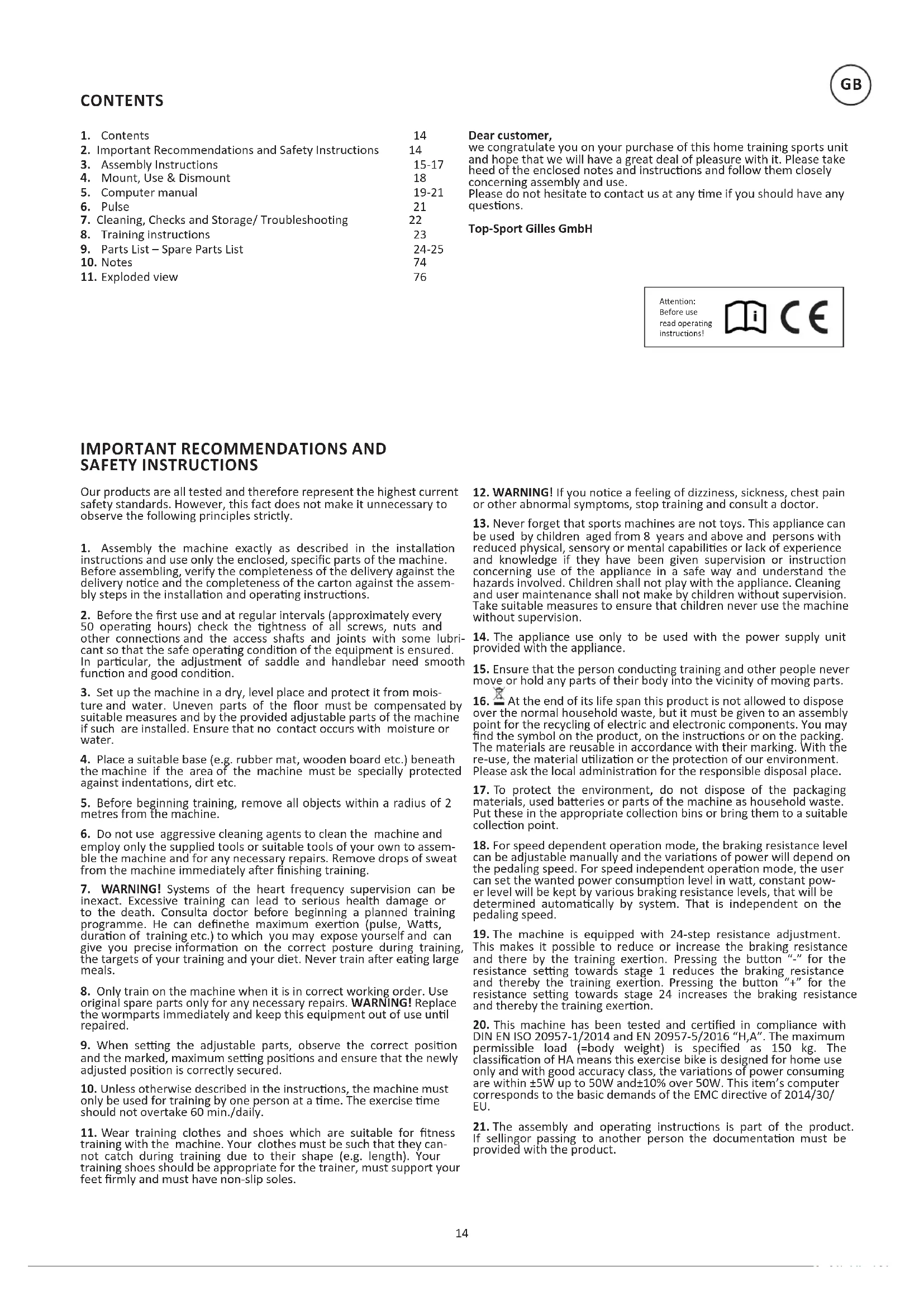 SAFETY INSTRUCTIONS Dear customer, we congratulate you on your purchase of this home training sports unit and hope that we will have a great deal of pleasure with it. Please take heed of the enclosed notes and instrucons and follow them closely concerning assembly and use. Please do not hesitate to contact us at any me if you should have any quesons. Top-Sport Gilles GmbH Our products are all tested and therefore represent the highest current safety standards. However, this fact does not make it unnecessary to observe the following principles strictly.