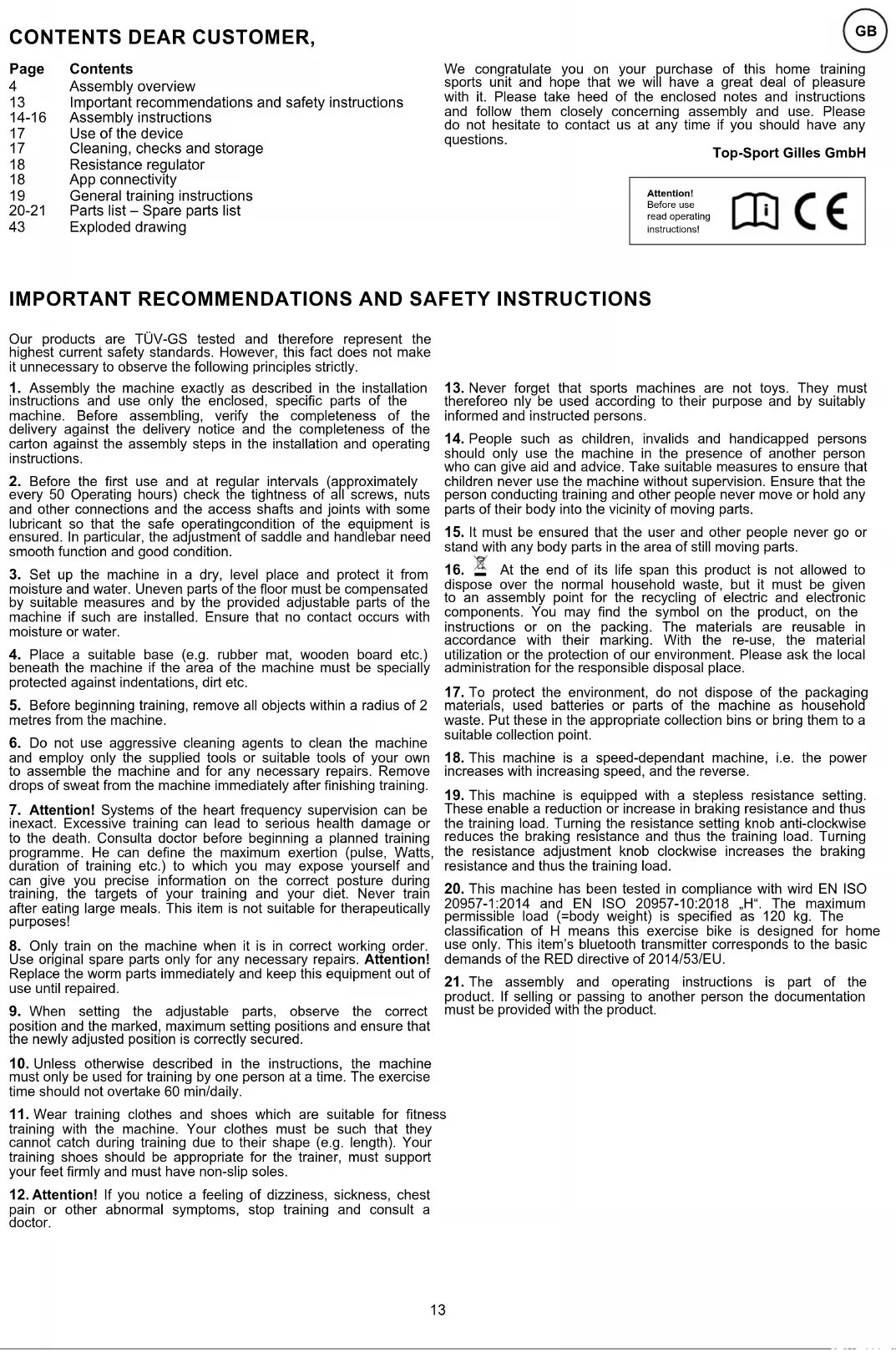 product. If selling or passing to another person the documentation must be provided with the product. CONTENTS DEAR CUSTOMER, We congratulate you on your purchase of this home training sports unit and hope that we will have a great deal of pleasure with it. Please take heed of the enclosed notes and instructions and follow them closely concerning assembly and use. Please do not hesitate to contact us at any time if you should have any questions. Top-Sport Gilles GmbH ContentsPage Attention! Before use read operating instructions!