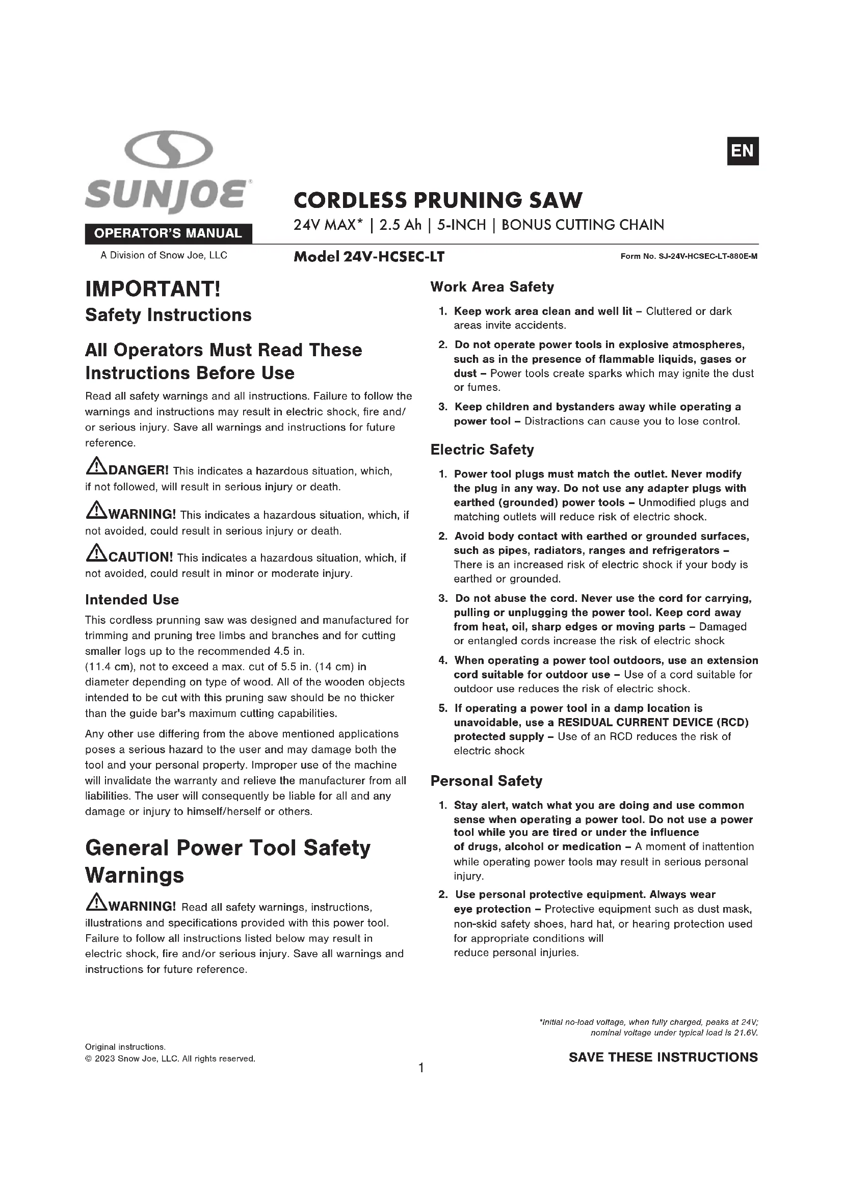 24V-HCSEC-LT - Saw Sun Joe - Free user manual and instructions