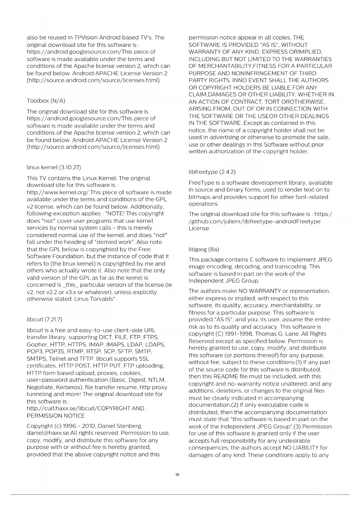 Open Source License Android (5.1.0) This TV contains the Android Lollipop Software. Android is a Linux-based operating system designed primarily for touch screen mobile devices such as smartphones and tablet computers. This software will 55also be reused in TPVision Android based TV's. The original download site for this software is : https://android.googlesource.com/This piece of software is made available under the terms and conditions of the Apache license version 2, which can be found below. Android APACHE License Version 2 (http://source.android.com/source/licenses.html) Toolbox (N/A) The original download site for this software is : https://android.googlesource.com/This piece of software is made available under the terms and conditions of the Apache license version 2, which can be found below. Android APACHE License Version 2 (http://source.android.com/source/licenses.html) linux kernel (3.10.27) This TV contains the Linux Kernel. The original download site for this software is : http://www.kernel.org/.This piece of software is made available under the terms and conditions of the GPL v2 license, which can be found below. Additionally, following exception applies : "NOTE! This copyright does *not* cover user programs that use kernel services by normal system calls - this is merely considered normal use of the kernel, and does *not* fall under the heading of "derived work". Also note that the GPL below is copyrighted by the Free Software Foundation, but the instance of code that it refers to (the linux kernel) is copyrighted by me and others who actually wrote it. Also note that the only valid version of the GPL as far as the kernel is concerned is _this_ particular version of the license (ie v2, not v2.2 or v3.x or whatever), unless explicitly otherwise stated. Linus Torvalds" libcurl (7.21.7) libcurl is a free and easy-to-use client-side URL transfer library, supporting DICT, FILE, FTP, FTPS, Gopher, HTTP, HTTPS, IMAP, IMAPS, LDAP, LDAPS, POP3, POP3S, RTMP, RTSP, SCP, SFTP, SMTP, SMTPS, Telnet and TFTP. libcurl supports SSL certificates, HTTP POST, HTTP PUT, FTP uploading, HTTP form based upload, proxies, cookies, user+password authentication (Basic, Digest, NTLM, Negotiate, Kerberos), file transfer resume, http proxy tunneling and more! The original download site for this software is : http://curl.haxx.se/libcurl/COPYRIGHT AND PERMISSION NOTICE Copyright (c) 1996 - 2010, Daniel Stenberg, daniel@haxx.se.All rights reserved. Permission to use, copy, modify, and distribute this software for any purpose with or without fee is hereby granted, provided that the above copyright notice and this permission notice appear in all copies. THE