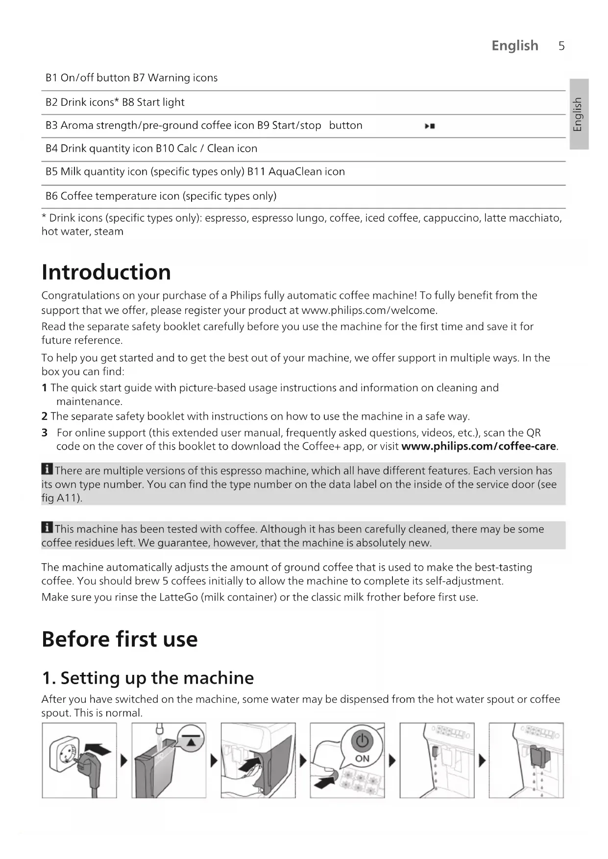 - Drink icons (specific types only): espresso, espresso lungo, coffee, iced coffee, cappuccino, latte macchiato, hot water, steam Introduction Congratulations on your purchase of a Philips fully automatic coffee machine! To fully benefit from the support that we offer, please register your product at www.philips.com/welcome. Read the separate safety booklet carefully before you use the machine for the first time and save it for future reference. To help you get started and to get the best out of your machine, we offer support in multiple ways. In the box you can find: 1 The quick start guide with picture-based usage instructions and information on cleaning and maintenance. 2 The separate safety booklet with instructions on how to use the machine in a safe way. 3 For online support (this extended user manual, frequently asked questions, videos, etc.), scan the QR code on the cover of this booklet to download the Coffee+ app, or visit www.philips.com/coffee-care. There are multiple versions of this espresso machine, which all have different features. Each version has its own type number. You can find the type number on the data label on the inside of the service door (see fig A11). This machine has been tested with coffee. Although it has been carefully cleaned, there may be some coffee residues left. We guarantee, however, that the machine is absolutely new. The machine automatically adjusts the amount of ground coffee that is used to make the best-tasting coffee. You should brew 5 coffees initially to allow the machine to complete its self-adjustment. Make sure you rinse the LatteGo (milk container) or the classic milk frother before first use. Before first use