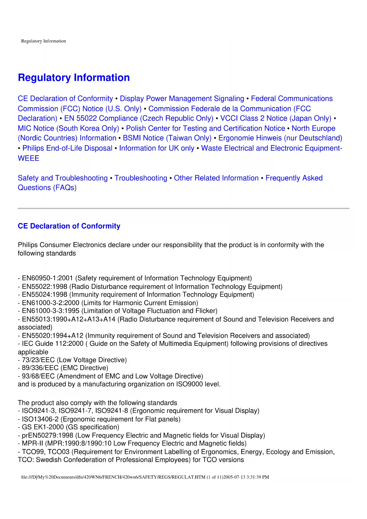 - Philips End-of-Life Disposal • Information for UK only • Waste Electrical and Electronic Equipment- WEEE Safety and Troubleshooting • Troubleshooting • Other Related Information • Frequently Asked Questions (FAQs) CE Declaration of Conformity Philips Consumer Electronics declare under our responsibility that the product is in conformity with the following standards - EN60950-1:2001 (Safety requirement of Information Technology Equipment) - EN55022:1998 (Radio Disturbance requirement of Information Technology Equipment) - EN55024:1998 (Immunity requirement of Information Technology Equipment) - EN61000-3-2:2000 (Limits for Harmonic Current Emission) - EN61000-3-3:1995 (Limitation of Voltage Fluctuation and Flicker) - EN55013:1990+A12+A13+A14 (Radio Disturbance requirement of Sound and Television Receivers and associated) - EN55020:1994+A12 (Immunity requirement of Sound and Television Receivers and associated) - IEC Guide 112:2000 ( Guide on the Safety of Multimedia Equipment) following provisions of directives applicable - 73/23/EEC (Low Voltage Directive) - 89/336/EEC (EMC Directive) - 93/68/EEC (Amendment of EMC and Low Voltage Directive) and is produced by a manufacturing organization on ISO9000 level. The product also comply with the following standards - ISO9241-3, ISO9241-7, ISO9241-8 (Ergonomic requirement for Visual Display) - ISO13406-2 (Ergonomic requirement for Flat panels) - GS EK1-2000 (GS specification) - prEN50279:1998 (Low Frequency Electric and Magnetic fields for Visual Display) - MPR-II (MPR:1990:8/1990:10 Low Frequency Electric and Magnetic fields) - TCO99, TCO03 (Requirement for Environment Labelling of Ergonomics, Energy, Ecology and Emission, TCO: Swedish Confederation of Professional Employees) for TCO versions file:///D|/My%20Documents/dfu/420WN6/FRENCH/420wn6/SAFETY/REGS/REGULAT.HTM (1 of 11)2005-07-13 3:31:39 PMRegulatory Information