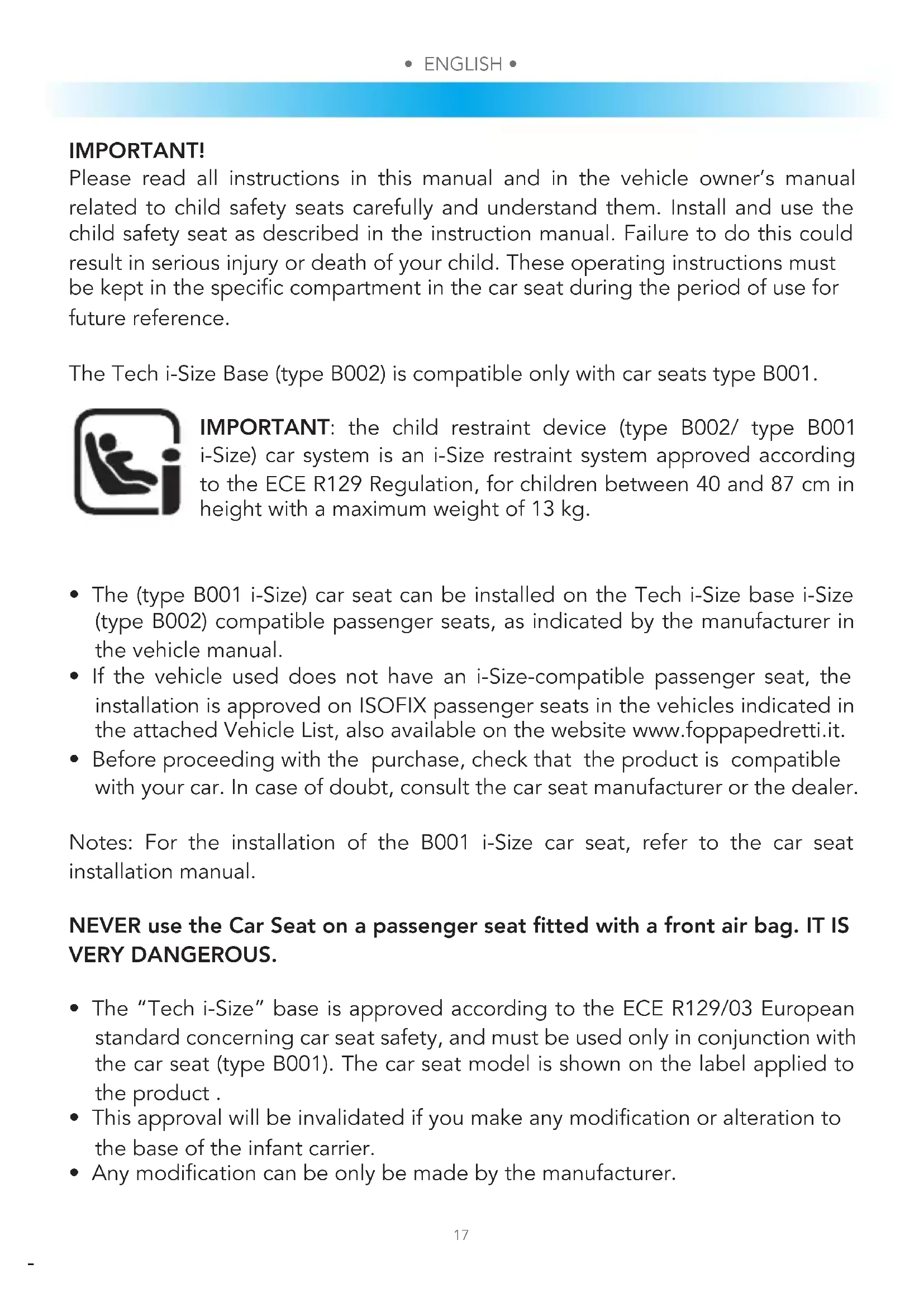 IMPORTANT! Please read all instructions in this manual and in the vehicle owner’s manual related to child safety seats carefully and understand them. Install and use the child safety seat as described in the instruction manual. Failure to do this could result in serious injury or death of your child. These operating instructions must be kept in the specic compartment in the car seat during the period of use for future reference. The Tech i-Size Base (type B002) is compatible only with car seats type B001. IMPORTANT: the child restraint device (type B002/ type B001 i-Size) car system is an i-Size restraint system approved according to the ECE R129 Regulation, for children between 40 and 87 cm in height with a maximum weight of 13 kg.