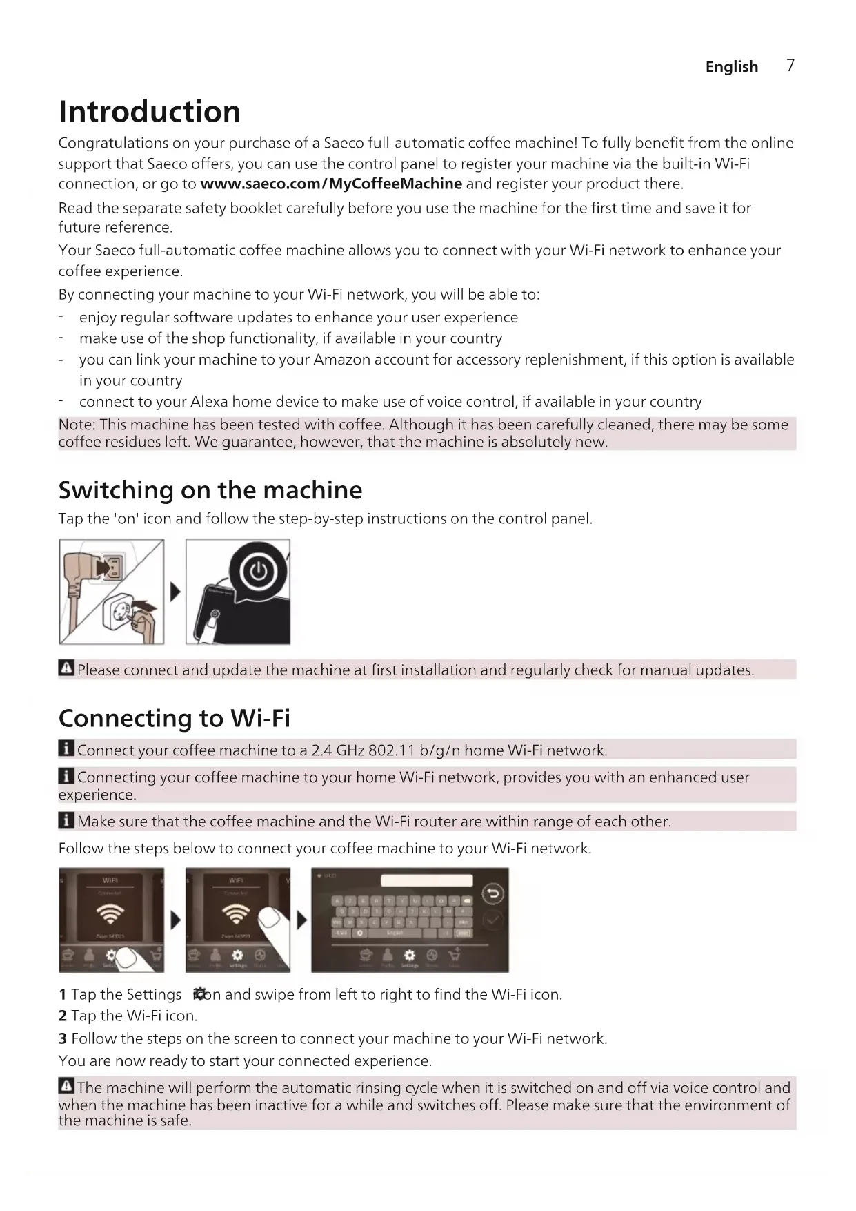 connect to your Alexa home device to make use of voice control, if available in your country Note: This machine has been tested with coffee. Although it has been carefully cleaned, there may be some coffee residues left. We guarantee, however, that the machine is absolutely new. Switching on the machine Tap the 'on' icon and follow the step-by-step instructions on the control panel. Please connect and update the machine at first installation and regularly check for manual updates. Connecting to Wi-Fi Connect your coffee machine to a 2.4 GHz 802.11 b/g/n home Wi-Fi network. Connecting your coffee machine to your home Wi-Fi network, provides you with an enhanced user experience. Make sure that the coffee machine and the Wi-Fi router are within range of each other. Follow the steps below to connect your coffee machine to your Wi-Fi network. 1 Tap the Settings icon and swipe from left to right to find the Wi-Fi icon. 2 Tap the Wi-Fi icon. 3 Follow the steps on the screen to connect your machine to your Wi-Fi network. You are now ready to start your connected experience. The machine will perform the automatic rinsing cycle when it is switched on and off via voice control and when the machine has been inactive for a while and switches off. Please make sure that the environment of the machine is safe.8 English Special functions Special function Purpose With CoffeeMaestro you can personalize your coffee by selecting a pre-set taste profile (Delicato, Intenso, Forte) for your beverage instead of changing the settings yourself. HygieSteam function automatically cleans the milk system, removing microorganisms: use it after brewing cappuccino or other milk-based drinks. Our durable grinder is made from 100% ceramic to be exceptionally hard and precise. It can be adjusted to your taste with 12-step levels. The Maintenance Dashboard gives you a helpful overview and notifies you with status information on things like that the AquaClean is running low. Brewing drinks General steps To brew a drink, you need to follow a few simple steps. 1 Fill the water tank with tap water and fill the bean hopper with beans. 2 Place one or two cups under the height-adjustable dispensing spout. Slide the dispensing spout up or down to adjust the height to the size of the cup or glass you are using. 3 Tap the Drinks icon to enter the 'Drinks' menu. Swipe from left to right to select your drink by tapping on it.