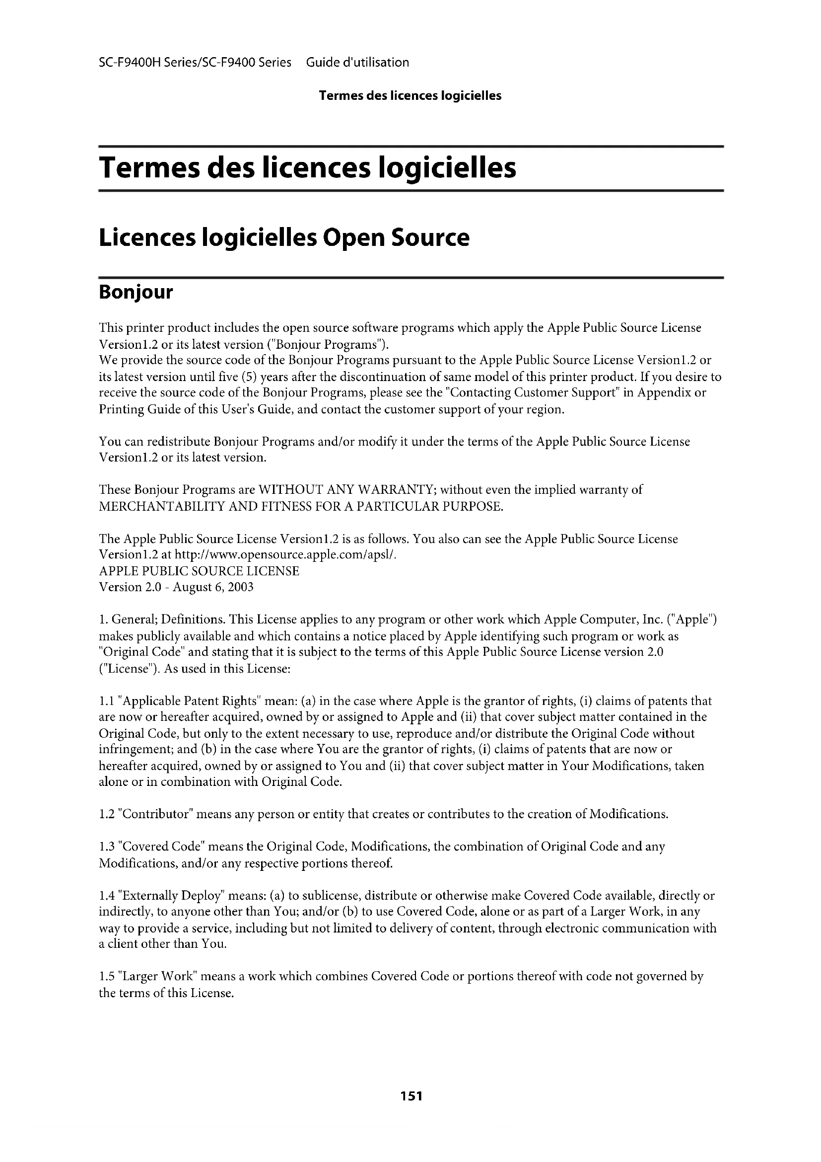 the terms of this License. SC-F9400H Series/SC-F9400 Series Guide d'utilisation Termes des licences logicielles 1511.6 "Modifications" mean any addition to, deletion from, and/or change to, the substance and/or structure of the Original Code, any previous Modifications, the combination of Original Code and any previous Modifications, and/ or any respective portions thereof. When code is released as a series of files, a Modification is: (a) any addition to or deletion from the contents of a file containing Covered Code; and/or (b) any new file or other representation of computer program statements that contains any part of Covered Code.