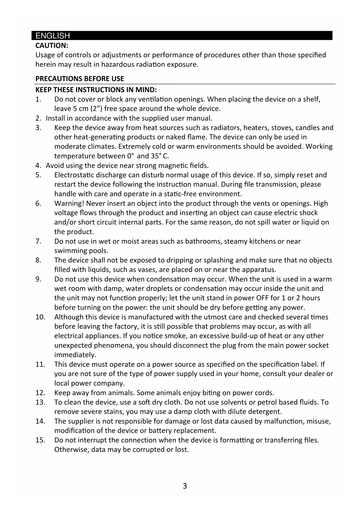 3. Keep the device away from heat sources such as radiators, heaters, stoves, candles and