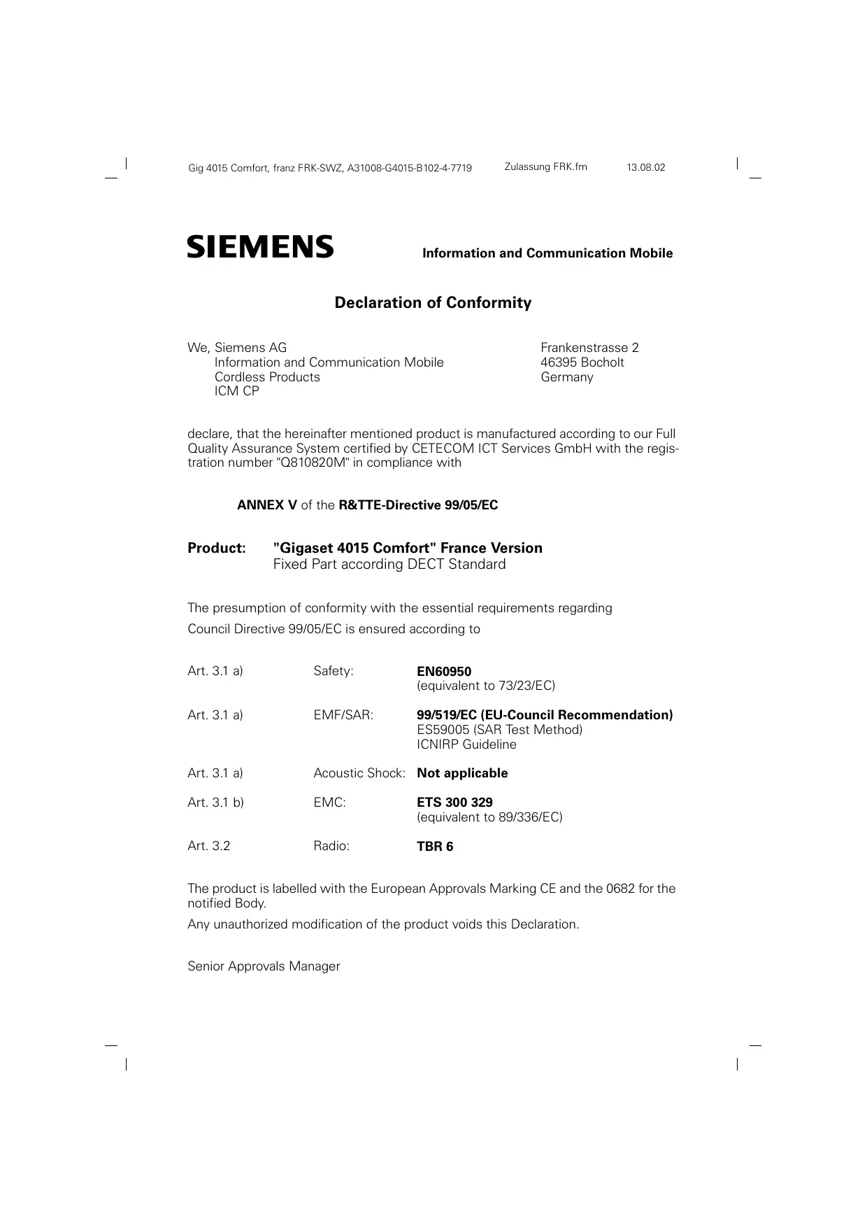 Information and Communication Mobile Declaration of Conformity We, Siemens AG Information and Communication Mobile Cordless Products ICM CP Frankenstrasse 2 46395 Bocholt Germany declare, that the hereinafter mentioned product is manufactured according to our Full Quality Assurance System certified by CETECOM ICT Services GmbH with the registration number "Q810820M" in compliance with ANNEX V of the R&TTE-Directive 99/05/EC Product: "Gigaset 4015 Comfort" France Version Fixed Part according DECT Standard The presumption of conformity with the essential requirements regarding Council Directive 99/05/EC is ensured according to Art. 3.1 a) Safety: EN60950 (equivalent to 73/23/EC) Art. 3.1 a) EMF/SAR: 99/519/EC (EU-Council Recommendation) ES59005 (SAR Test Method) ICNIRP Guideline Art. 3.1 a) Acoustic Shock: Not applicable Art. 3.1 b) EMC: ETS 300 329 (equivalent to 89/336/EC) Art. 3.2 Radio: TBR 6 The product is labelled with the European Approvals Marking CE and the 0682 for the notified Body. Any unauthorized modification of the product voids this Declaration. Senior Approvals Manager