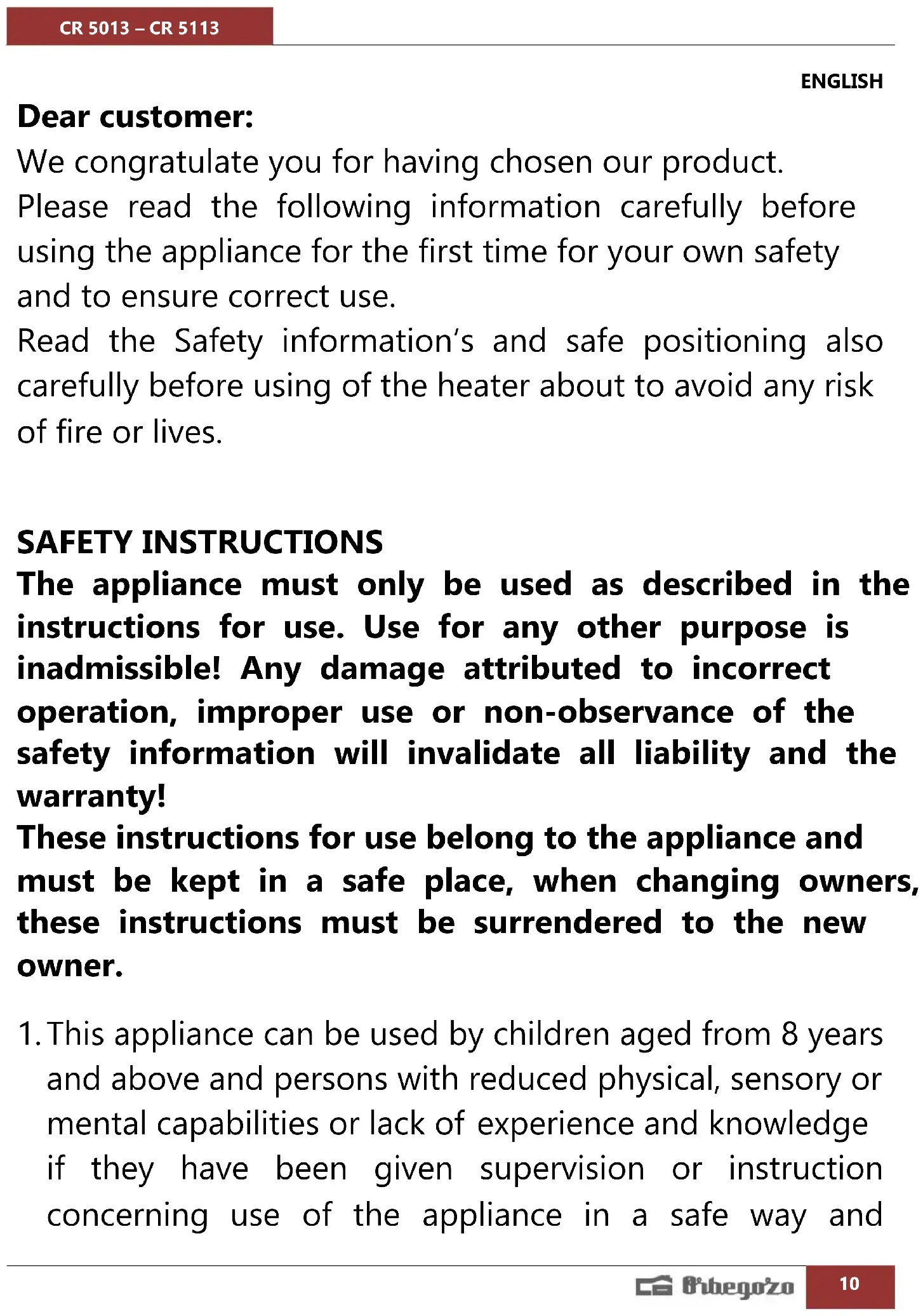 To prevent damage and risks due to overheating, the built-in overheating safety device cuts off the power as soon as the heating elements become too hot. MAINTENANCE - Before undertaking any maintenance operation, disconnect the appliance from the power supply. - This appliance does not require any particular maintenance. For cleaning it is recommended to use a soft moist rag and neutral detergent. Do not use an abrasive cloth or devices which could affect the outward appearance of the appliance. Check that the parts exposed to the heat rays and the ventilation are free of dust and dirt. During cleaning, be careful not to touch the quartz heating elements. - In case of breakdown and/or poor function of the appliance, disconnect the appliance from the power supply and contact an authorized service center. Always request the use of original spare p arts. The non-observation of these instructions can compromise the safety of the appliance and render guaranty invalid.CR 5013 – CR 5113