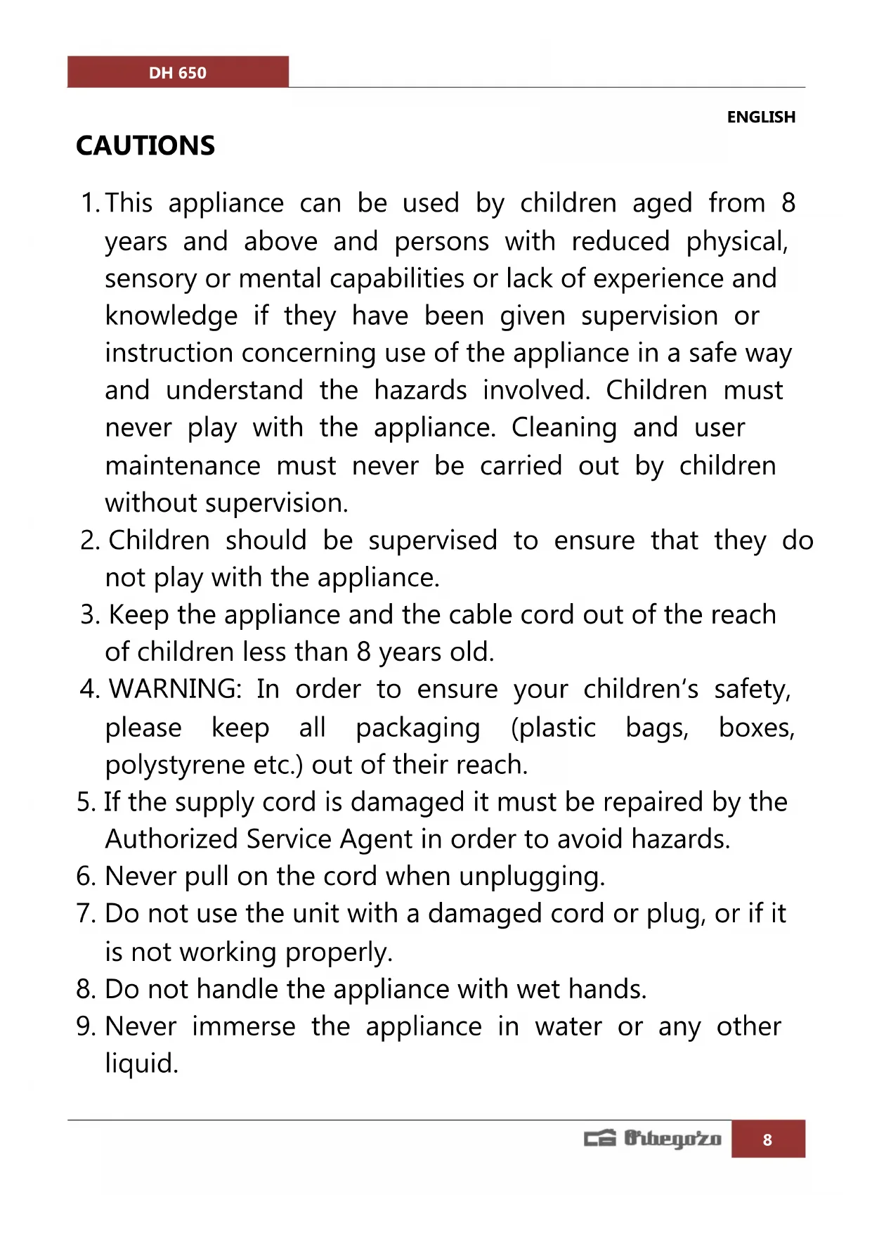 USER MANUAL DH 650 Orbegozo