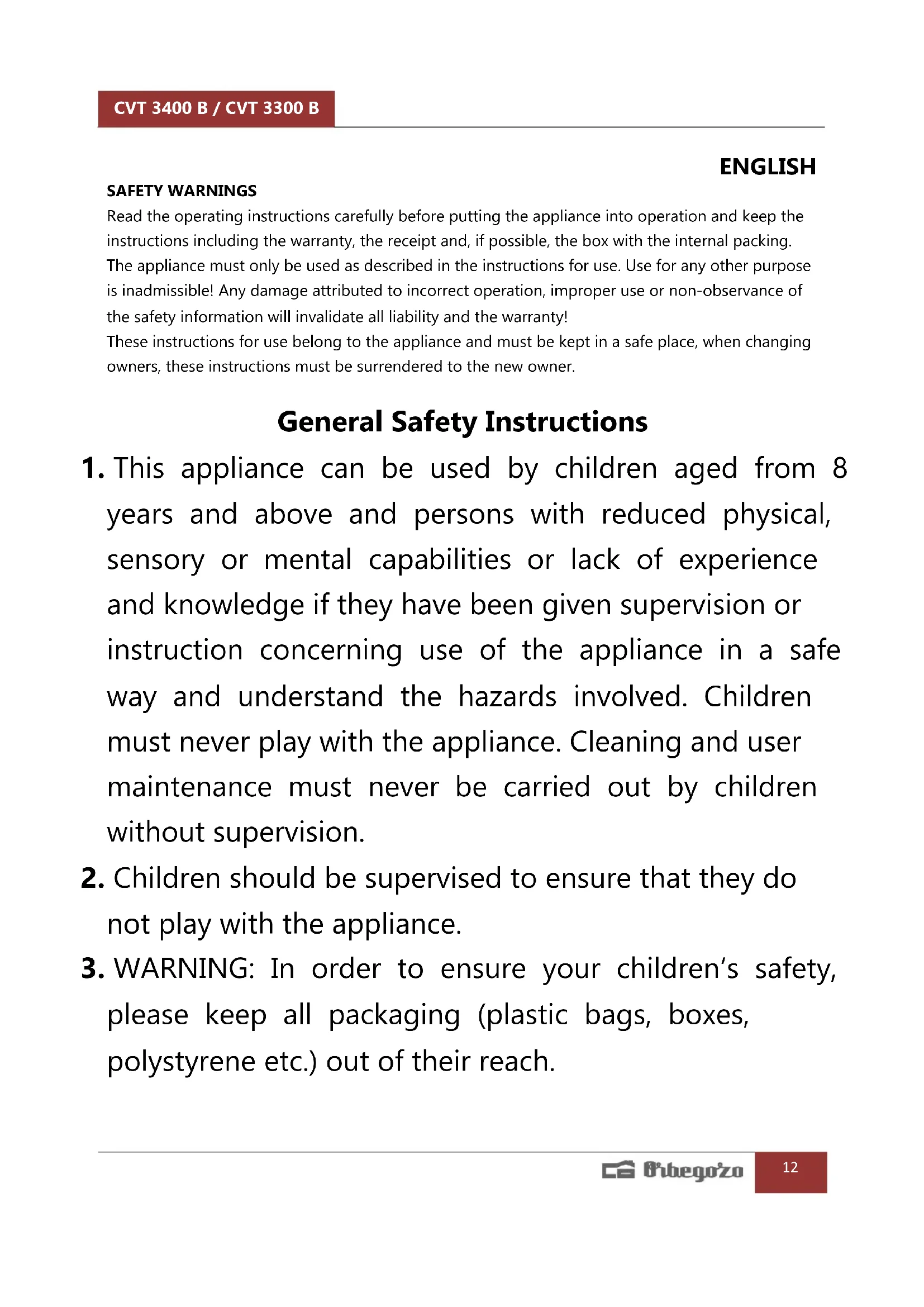 please keep all packaging (plastic bags, boxes, polystyrene etc.) out of their reach.CVT 3400 B / CVT 3300 B