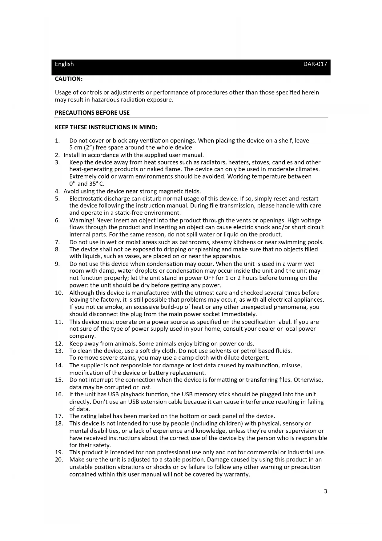 Version: 3.03 English DAR-017 CAUTION: Usage of controls or adjustments or performance of procedures other than those specified herein may result in hazardous radiation exposure.