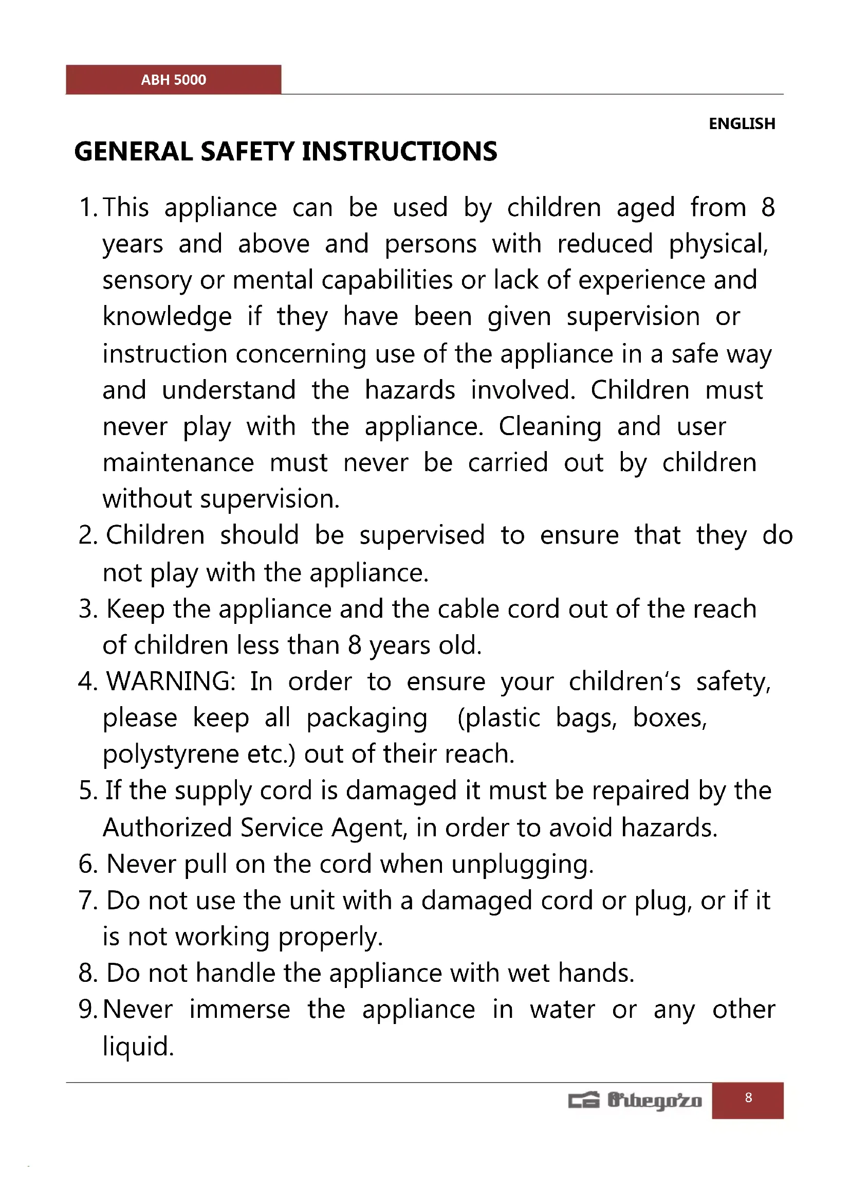 The European directive 2012/19/EU on Waste Electrical and Electronic Equipment (WEEE), requires that old household electrical appliances must not be disposed of in the normal unsorted municipal waste stream. Old appliances must be collected separately in order to optimize the recovery and recycling of the materials they contain, and reduce the impact on human health and the environment. The crossed out “wheeled bin” symbol on the product reminds you of your obligation, that when you dispose of the appliance, it must be separately collected. Consumers should contact their local authority or retailer for information concerning the correct disposal of their old appliance. DECLARATION OF CONFORMITY: This device complies with the requirements of the Low Voltage Directive 2014/35/EU and the requirements of the EMC directive 2014/30/EU. GUARANTEE This appliance is covered and is entitled to the legal guarantee in accordance with the legislation in force from the date of purchase. Keep the purchase receipt to be able to claim your right to the guarantee. To find the closest service to your location, contact through the following web link: https://orbegozo.com/asistencia-tecnica/ For any type of query, doubt or incident, you can contact us through our email shown on the main page of this manual or through our technical assistance service at https://orbegozo.com/contacto/ Orbegozo is not responsible for components and accessories that are subject to wear and tear due to use, as well as perishable compounds or those that have deteriorated due to improper use. Nor will it be held responsible if the owner has technically modified the device. Check the legal conditions on our website.ABH 5000
