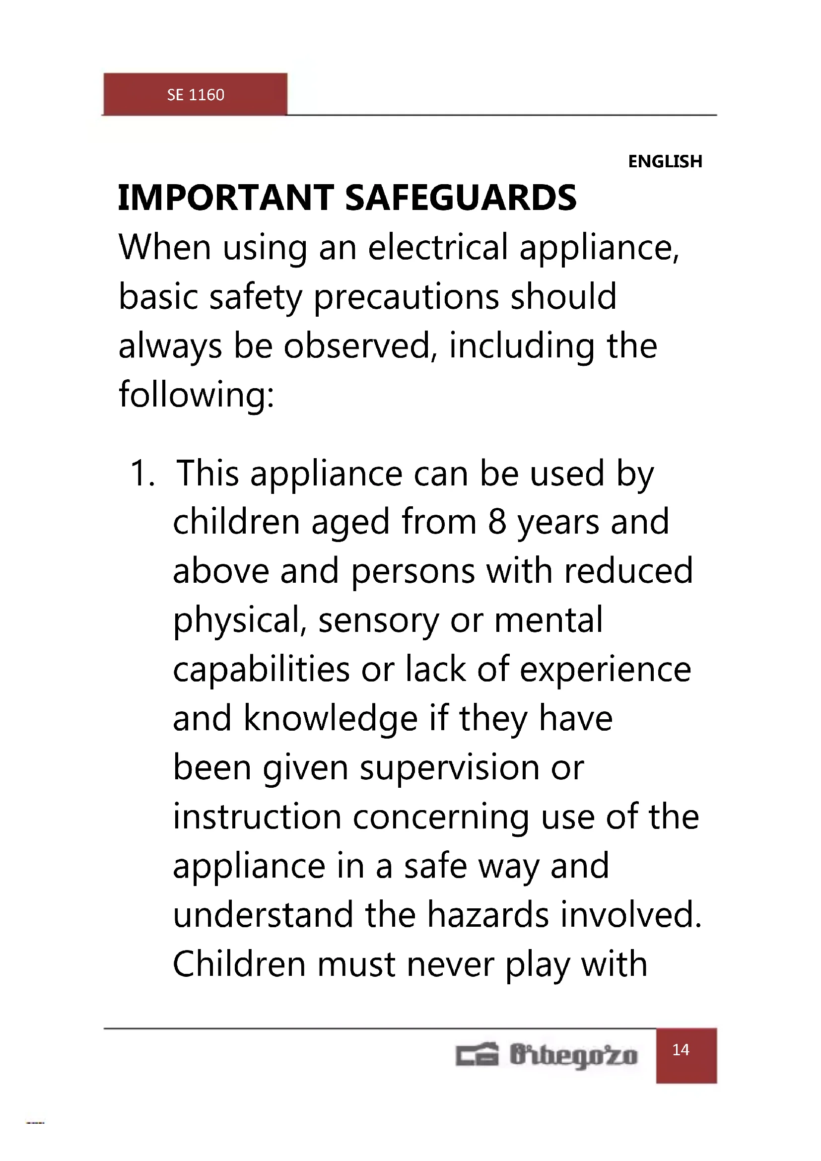 children aged from 8 years and above and persons with reduced physical, sensory or mental capabilities or lack of experience and knowledge if they have been given supervision or instruction concerning use of the appliance in a safe way and understand the hazards involved. Children must never play withSE 1160