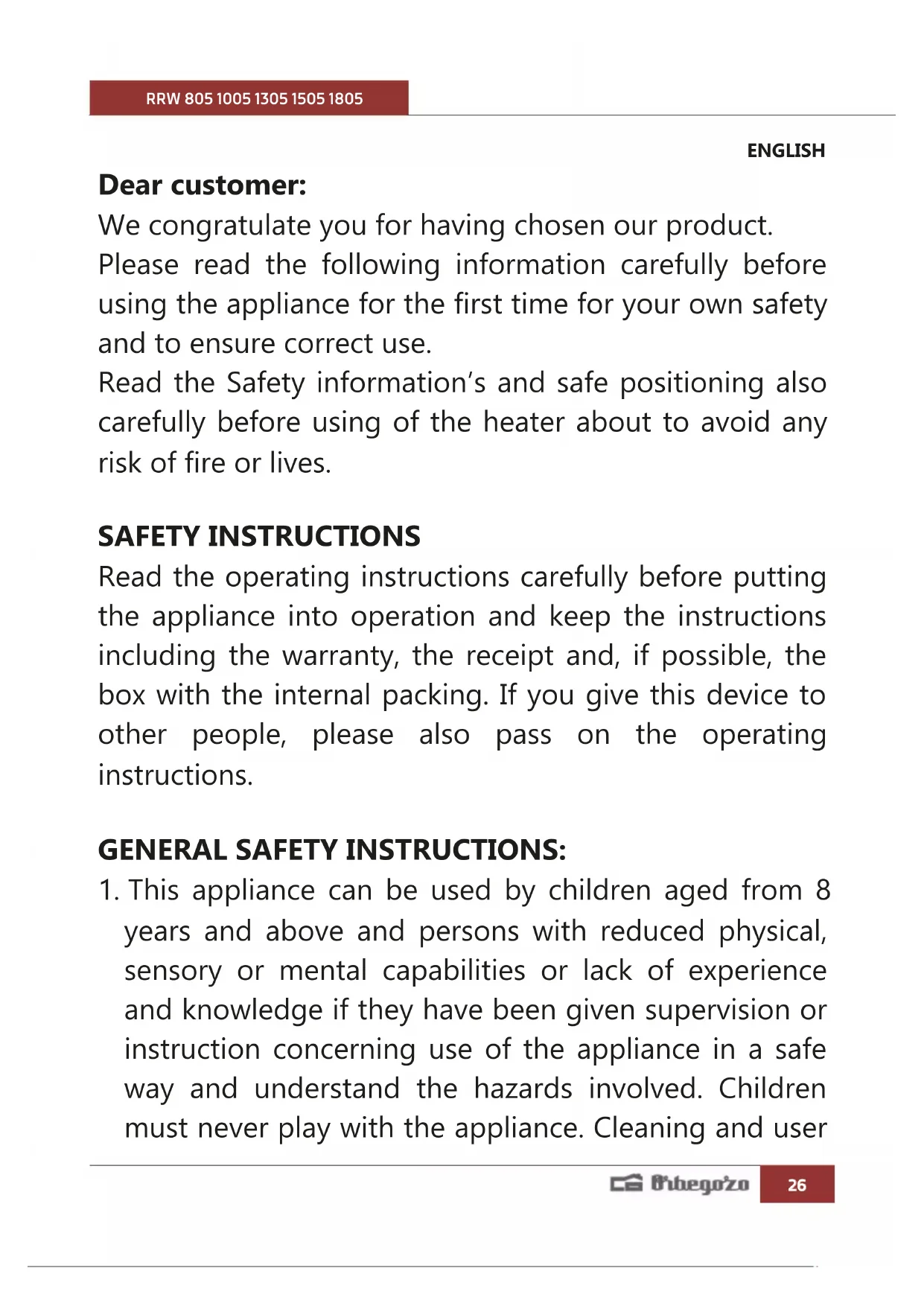 ENGLISH Dear customer: We congratulate you for having chosen our product. Please read the following information carefully before using the appliance for the first time for your own safety and to ensure correct use. Read the Safety information’s and safe positioning also carefully before using of the heater about to avoid any risk of fire or lives. SAFETY INSTRUCTIONS Read the operating instructions carefully before putting the appliance into operation and keep the instructions including the warranty, the receipt and, if possible, the box with the internal packing. If you give this device to other people, please also pass on the operating instructions. GENERAL SAFETY INSTRUCTIONS: