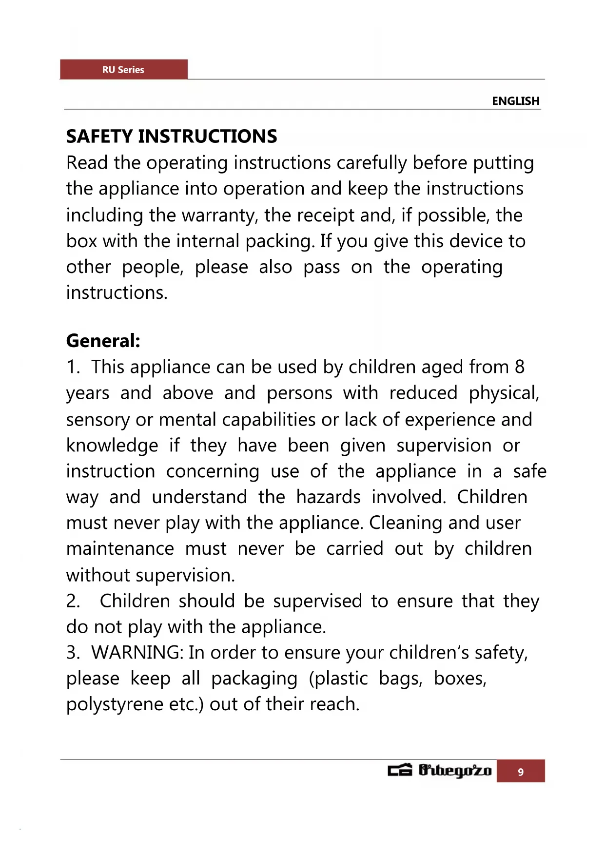 please keep all packaging (plastic bags, boxes, polystyrene etc.) out of their reach.RU Series