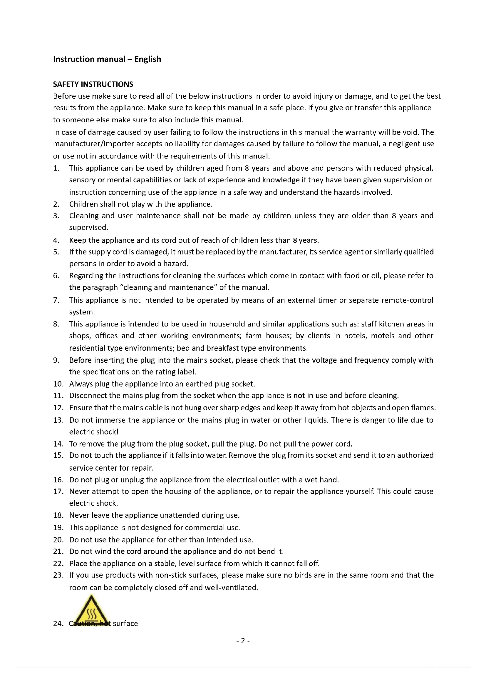 22. Place the appliance on a stable, level surface from which it cannot fall off.