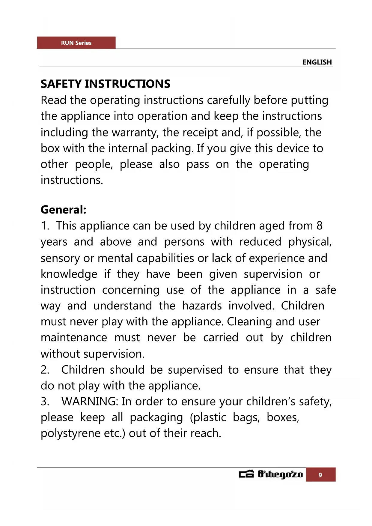 please keep all packaging (plastic bags, boxes, polystyrene etc.) out of their reach.RUN Series