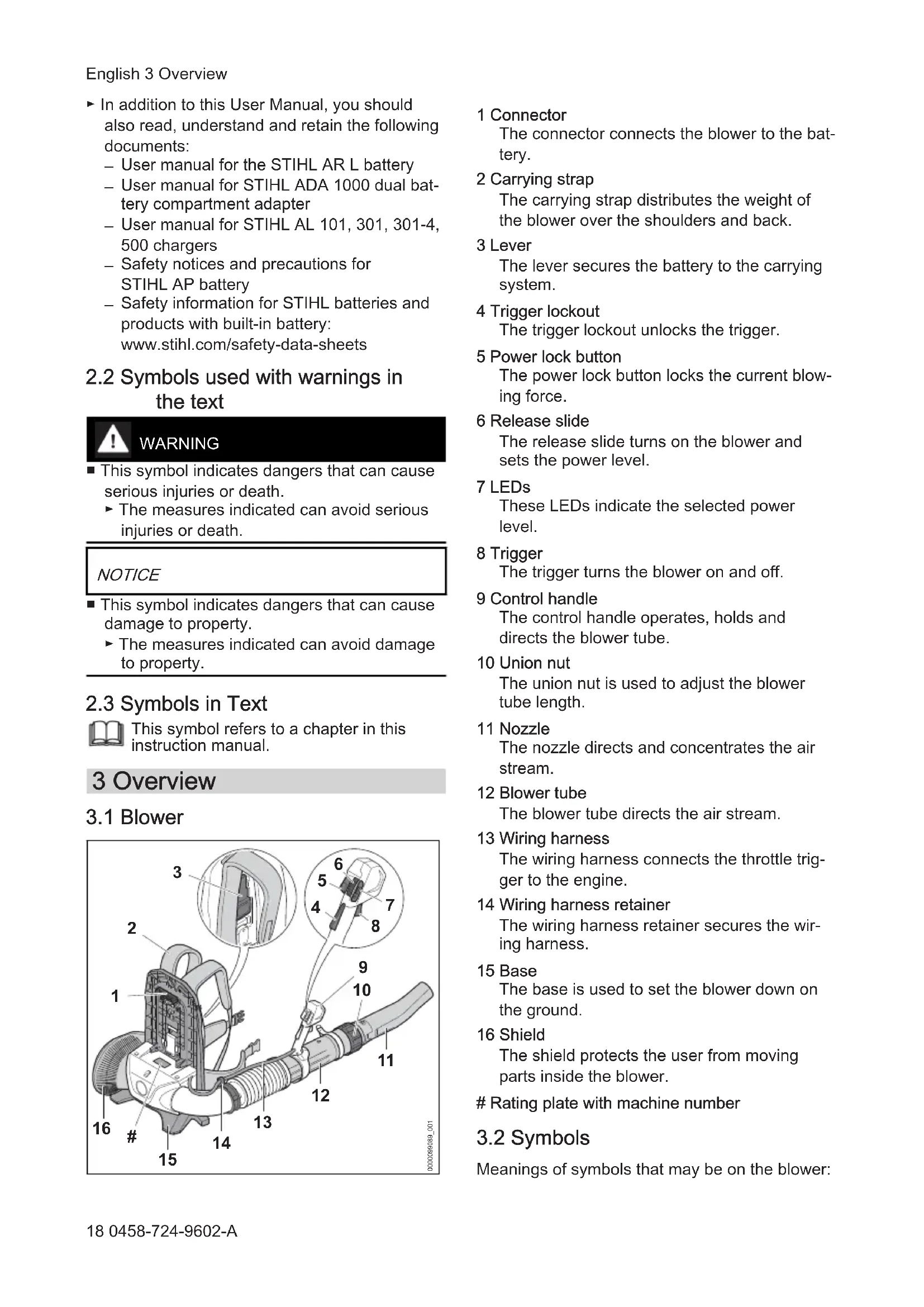 Meanings of symbols that may be on the blower: English 3 Overview 18 0458-724-9602-AThe union nut is unscrewed in this position. The blower tube can be extended. The union nut is locked in this position. The blower tube cannot be extended. The lever engages in position with an audi‐ ble click. Turn in this direction to attach the nozzle. Push the release slide forward to turn the blower on and set the power levels. Activate and deactivate power lock but‐ ton.