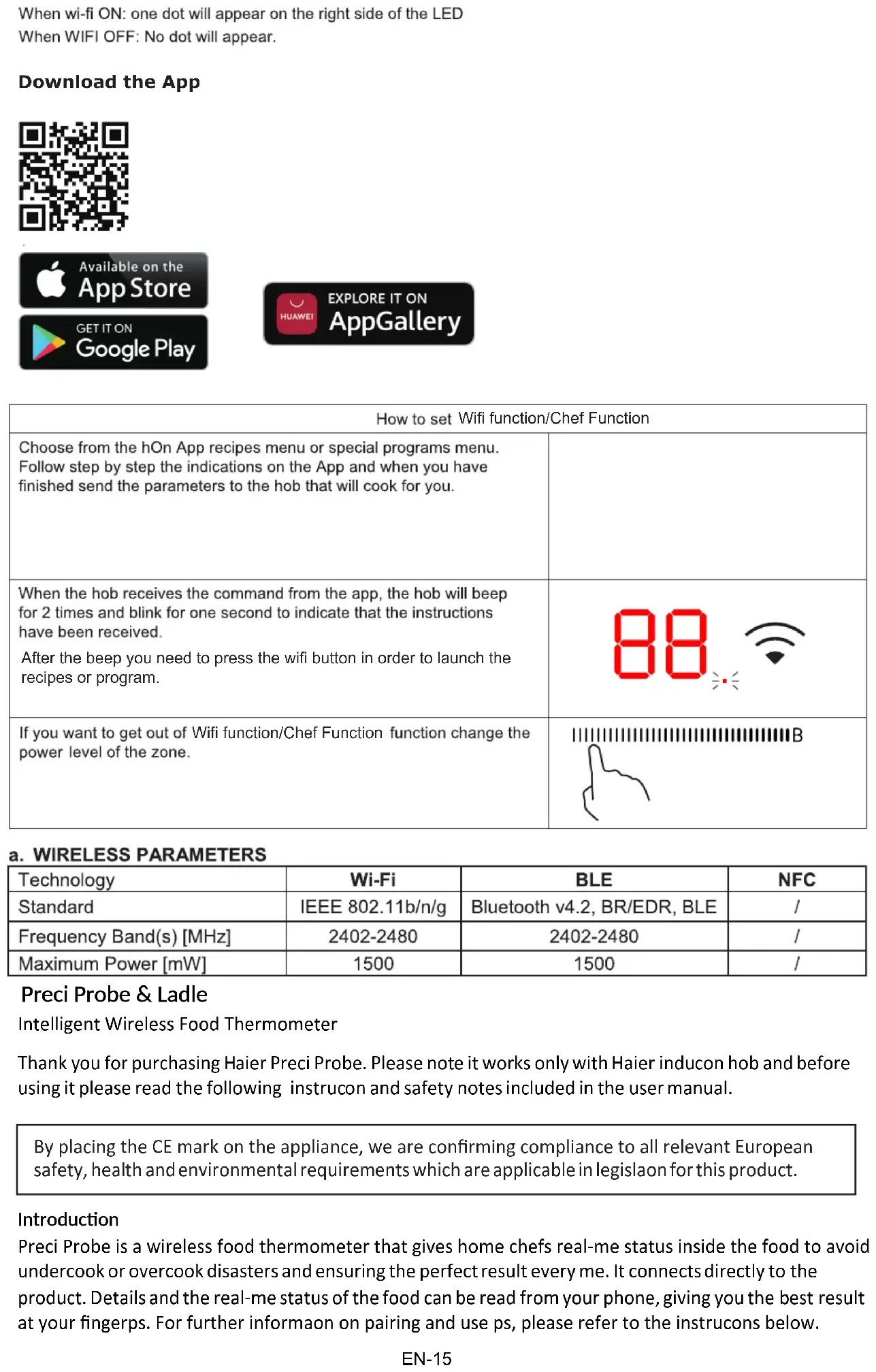 Wifi function/Chef Function Wifi function/Chef Function. Preci Probe & Ladle Intelligent Wireless Food Thermometer Thank you for purchasing Haier Preci Probe. Please note it works only with Haier induction hob and before using it please read the following instruction and safety notes included in the user manual. Introduction Preci Probe is a wireless food thermometer that gives home chefs real-time status inside the food to avoid undercook or overcook disasters and ensuring the perfect result every time. It connects directly to the product. Details and the real-time status of the food can be read from your phone, giving you the best result at your fingertips. For further information on pairing and use tips, please refer to the instructions below. By placing the CE mark on the appliance, we are confirming compliance to all relevant European safety, health and environmental requirements which are applicable in legislation for this product.