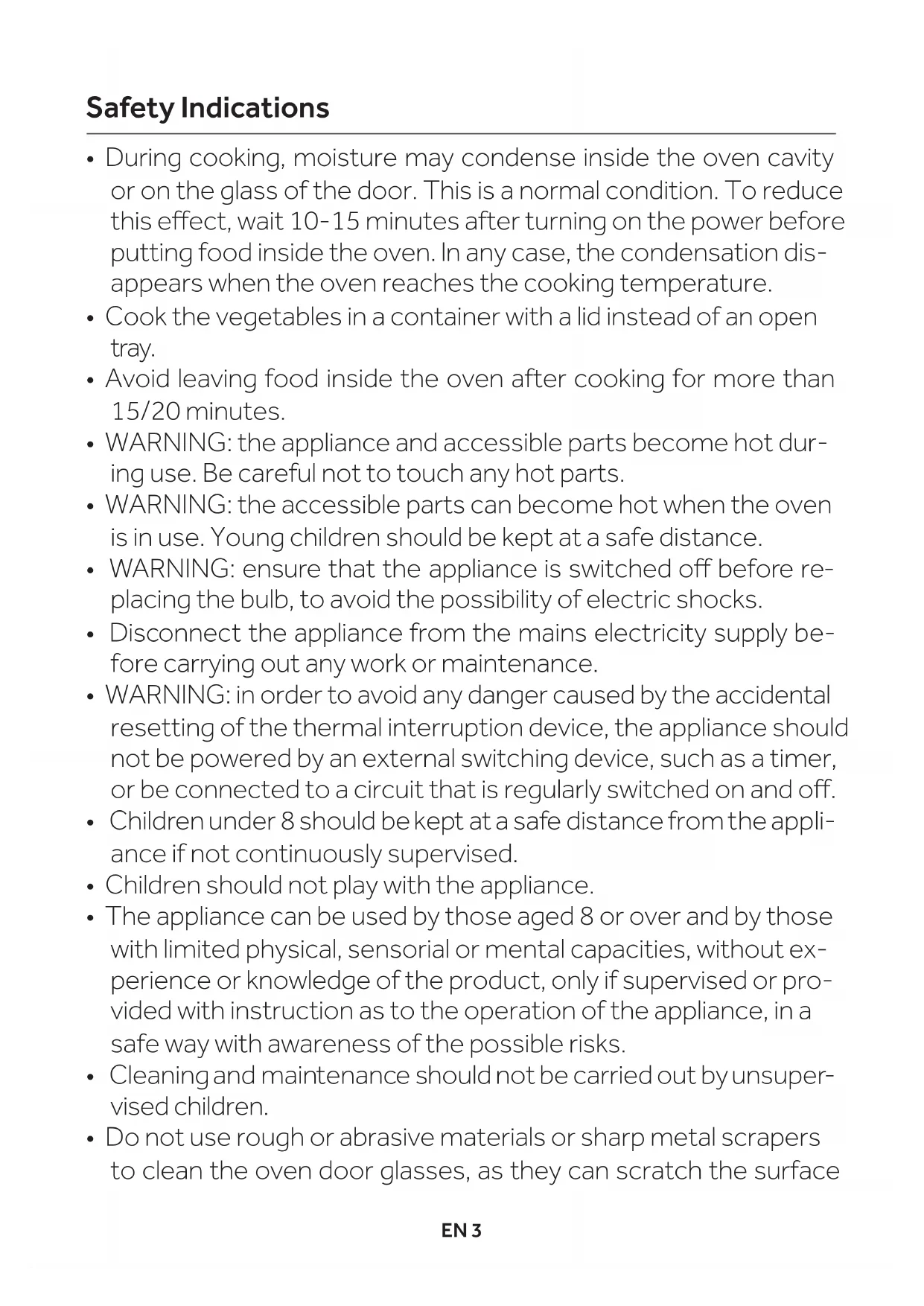 - Do not use rough or abrasive materials or sharp metal scrapers to clean the oven door glasses, as they can scratch the surface Safety IndicationsEN 4 and cause the glass to shatter.