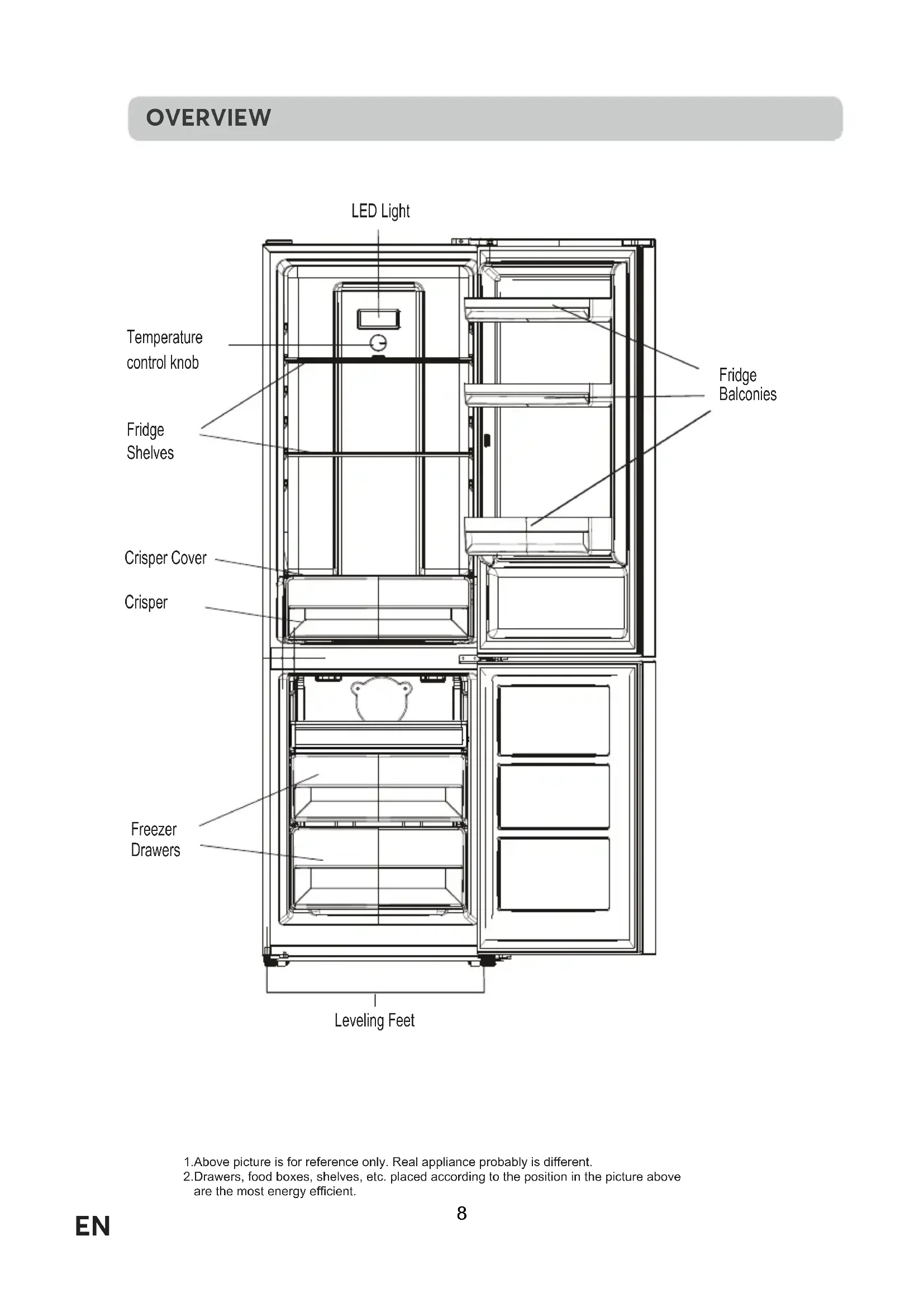EN2 EN3 EN4 EN5 EN6 EN7 EN1.Above picture is for reference only. Real appliance probably is different. 2.Drawers, food boxes, shelves, etc. placed according to the position in the picture above are the most energy efficient. Freezer Drawers Fridge Balconies Fridge Shelves Crisper Crisper Cover Leveling Feet LED Light Temperature control knob OVERVIEW