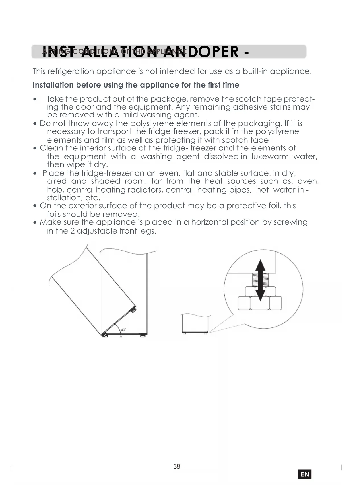 - Make sure the appliance is placed in a horizontal position by screwing in the 2 adjustable front legs. Installation before using the appliance for the first time elements and film as well as protecting it with scotch tape