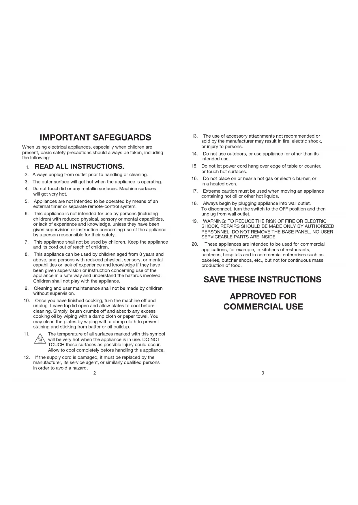 a. Time and Temperature Settings b. + and – Buttons c. Start/Stop Timer Button SPECIFICATIONS Model Electrical Plug Approval WSC300 120V, 60Hz, 1800W 5-15P TUVus, NSF Out of Box Dimensions: Depth – 21.875 inches (55.5 cm) Width – 15.5 inches (38.7 cm) Height Closed – 9.375 inches (23.8 cm) Height Open – 24.75 inches (62.9 cm) Cooking surface diameter – 13.5 inches (34.5 cm) OPERATING INSTRUCTIONS