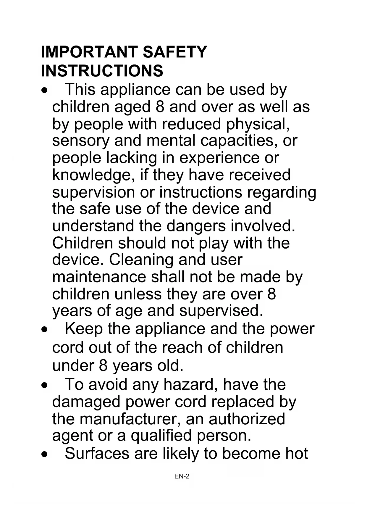 - This appliance can be used by children aged 8 and over as well as by people with reduced physical, sensory and mental capacities, or people lacking in experience or knowledge, if they have received supervision or instructions regarding the safe use of the device and understand the dangers involved. Children should not play with the device. Cleaning and user maintenance shall not be made by children unless they are over 8 years of age and supervised.