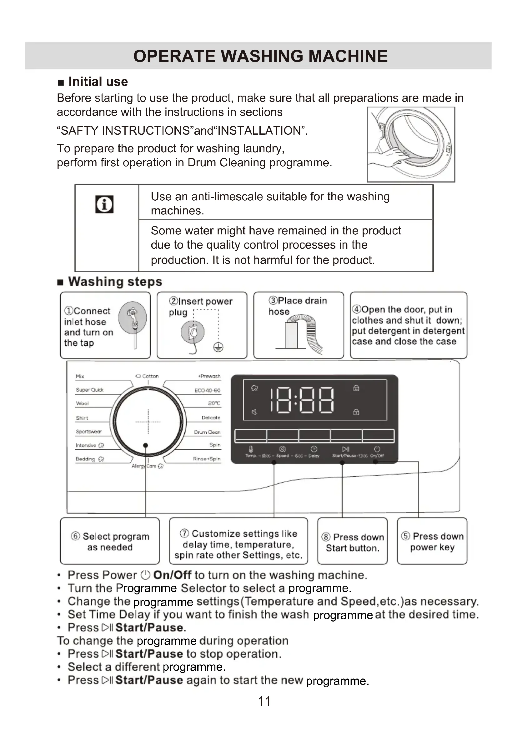 Before starting to use the product, make sure that all preparations are made in accordance with the instructions in sections Initial use “SAFTY INSTRUCTIONS”and“INSTALLATION”. To prepare the product for washing laundry, perform first operation in Drum Cleaning programme. Use an anti-limescale suitable for the washing machines. Some water might have remained in the product due to the quality control processes in the production. It is not harmful for the product. Programme programme programme programme. programme. programme. programme12
