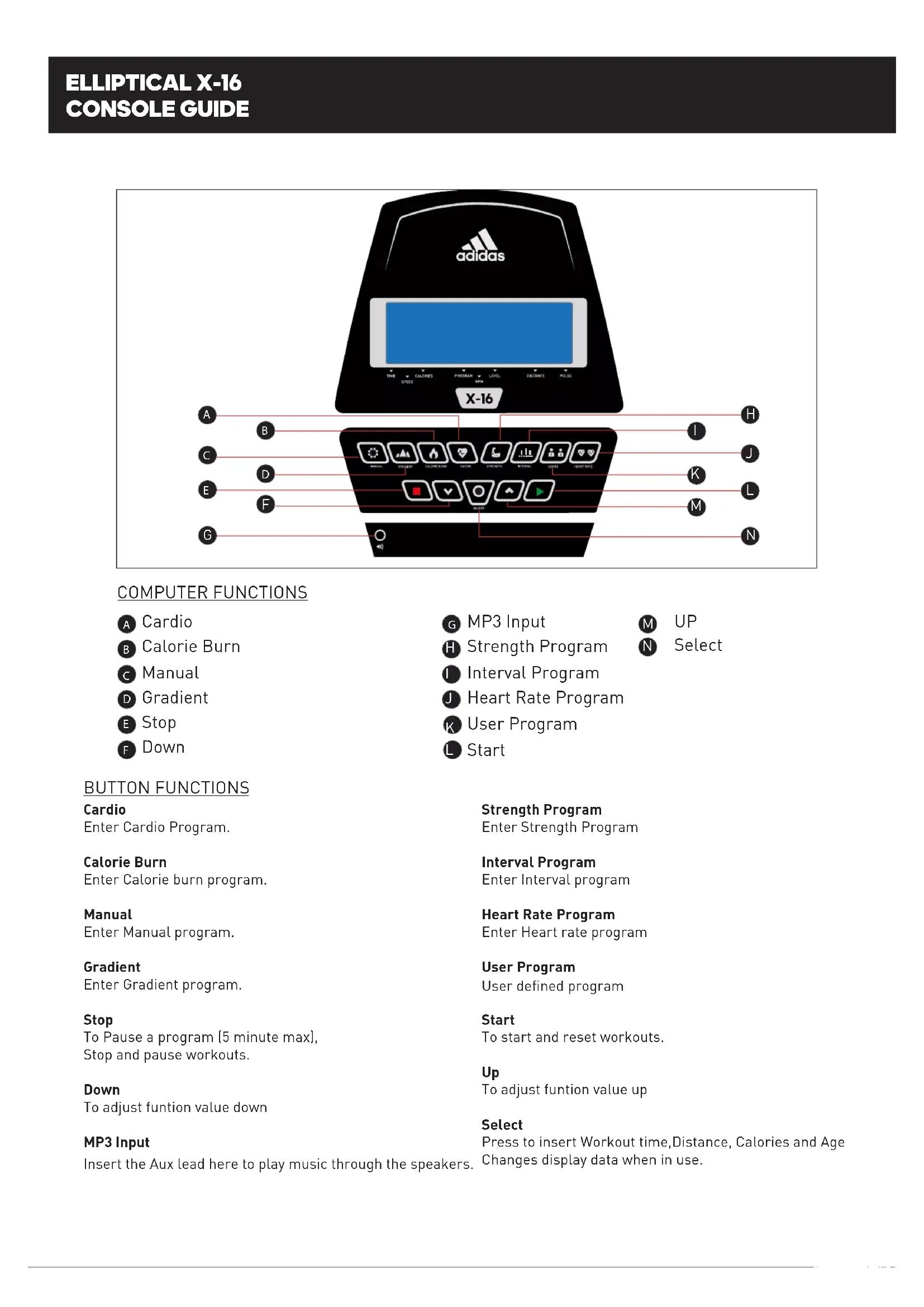 Select Cardio Enter Cardio Program. Calorie Burn Enter Calorie burn program. Manual Enter Manual program. Gradient Enter Gradient program. Stop To Pause a program (5 minute max), Stop and pause workouts. Down To adjust funtion value down MP3 Input Insert the Aux lead here to play music through the speakers. Strength Program Enter Strength Program Interval Program Enter Interval program Heart Rate Program Enter Heart rate program User Program User dened program Start To start and reset workouts.