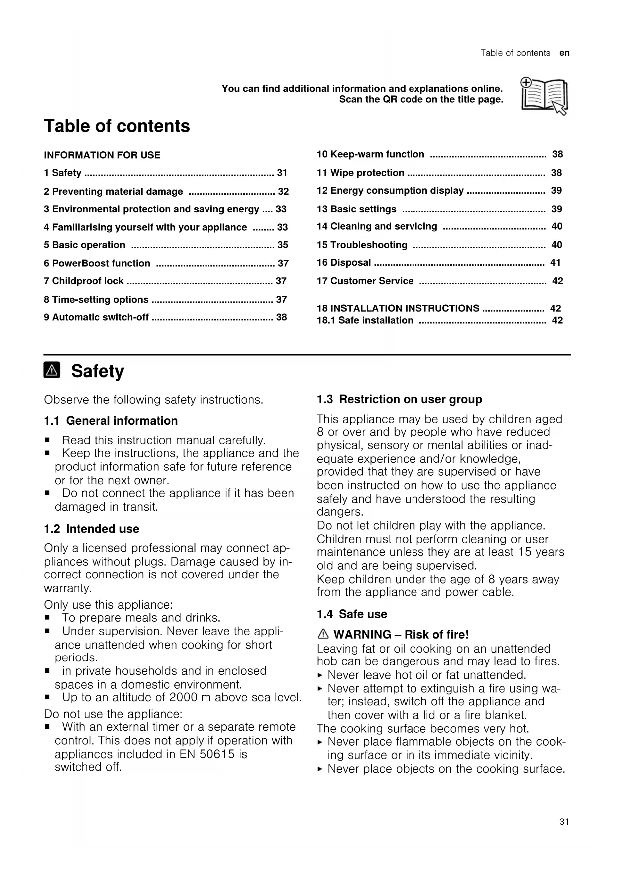 Safety 1 Safety Observe the following safety instructions. 1.1 General information ¡ Read this instruction manual carefully. ¡ Keep the instructions, the appliance and the product information safe for future reference or for the next owner. ¡ Do not connect the appliance if it has been damaged in transit. 1.2 Intended use Only a licensed professional may connect ap- pliances without plugs. Damage caused by in- correct connection is not covered under the warranty. Only use this appliance: ¡ To prepare meals and drinks. ¡ Under supervision. Never leave the appli- ance unattended when cooking for short periods. ¡ in private households and in enclosed spaces in a domestic environment. ¡ Up to an altitude of 2000m above sea level. Do not use the appliance: ¡ With an external timer or a separate remote control. This does not apply if operation with appliances included in EN 50615 is switched off. 1.3 Restriction on user group This appliance may be used by children aged 8 or over and by people who have reduced physical, sensory or mental abilities or inad- equate experience and/or knowledge, provided that they are supervised or have been instructed on how to use the appliance safely and have understood the resulting dangers. Do not let children play with the appliance. Children must not perform cleaning or user maintenance unless they are at least 15 years old and are being supervised. Keep children under the age of 8 years away from the appliance and power cable. 1.4 Safe use WARNING‒Risk of fire! Leaving fat or oil cooking on an unattended hob can be dangerous and may lead to fires. Never leave hot oil or fat unattended. Never attempt to extinguish a fire using wa- ter; instead, switch off the appliance and then cover with a lid or a fire blanket. The cooking surface becomes very hot. Never place flammable objects on the cook- ing surface or in its immediate vicinity. Never place objects on the cooking surface. 31en Preventing material damage The appliance will become hot. Do not keep combustible objects or aerosol cans in drawers directly underneath the hob. Hob covers can cause accidents, for example due to overheating, catching fire or materials shattering. Do not use hob covers. Food may catch fire. The cooking process must be monitored. A short process must be monitored continu- ously. WARNING‒Risk of burns! The appliance and its parts that can be touched become hot during use, particularly the hob surround, if fitted. Caution should be exercised here in order to avoid touching heating elements. Young children under 8 years of age must be kept away from the appliance. Hob guards may cause accidents. Never use hob guards. The appliance becomes hot during operation. Allow the appliance to cool down before cleaning. The cookware handles may become hot dur- ing operation. If the handles are illuminated by the heating zone, the handles may become particularly hot. Always cover the entire heating zone with the cookware. Use oven mitts. WARNING‒Risk of electric shock! Improper repairs are dangerous. Repairs to the appliance should only be car- ried out by trained specialist staff. Only use genuine spare parts when repairing the appliance. If the power cord of this appliance is dam- aged, it must be replaced by trained special- ist staff. If the appliance or the power cord is damaged, this is dangerous. Never operate a damaged appliance. If the surface is cracked, you must switch off the appliance in order to prevent a possible electrical shock. To do this, switch off the appliance via the fuse in the fuse box rather than at the main switch. Call customer service.