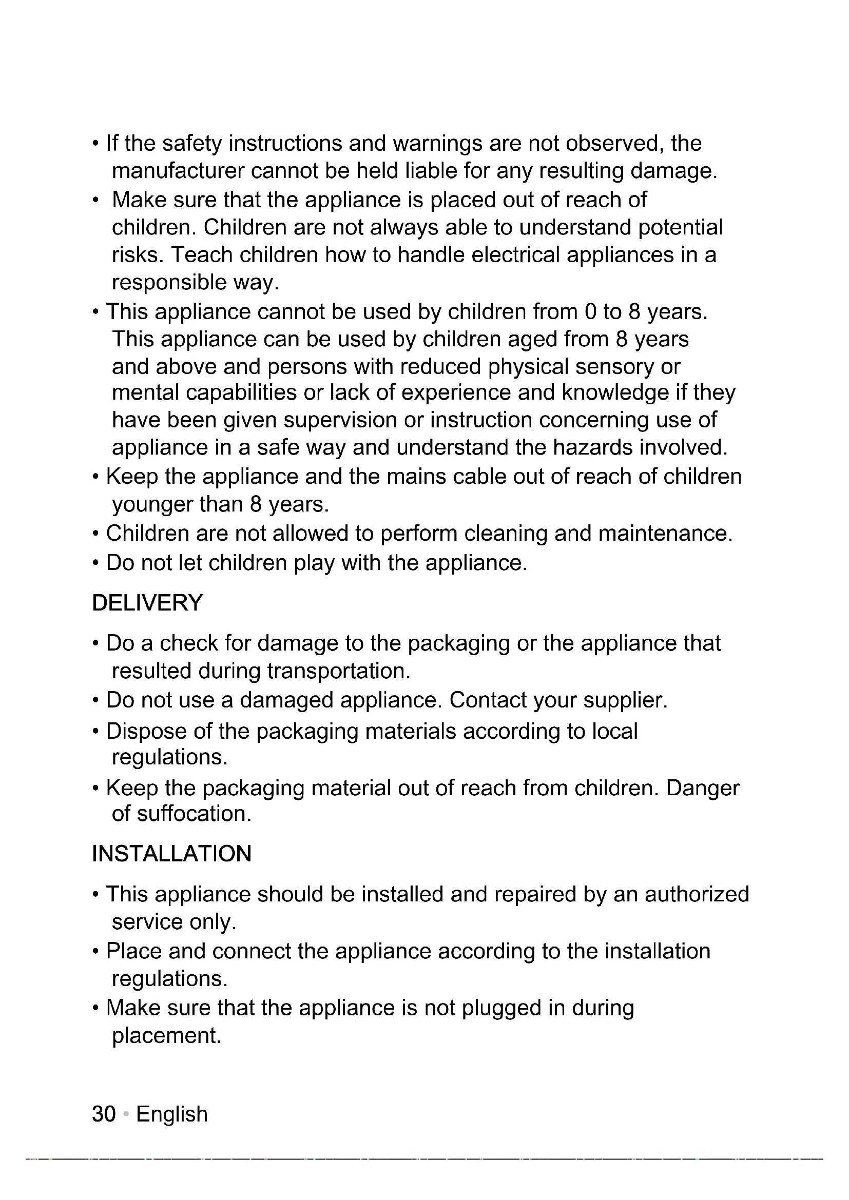 - Do not let children play with the appliance. DELIVERY