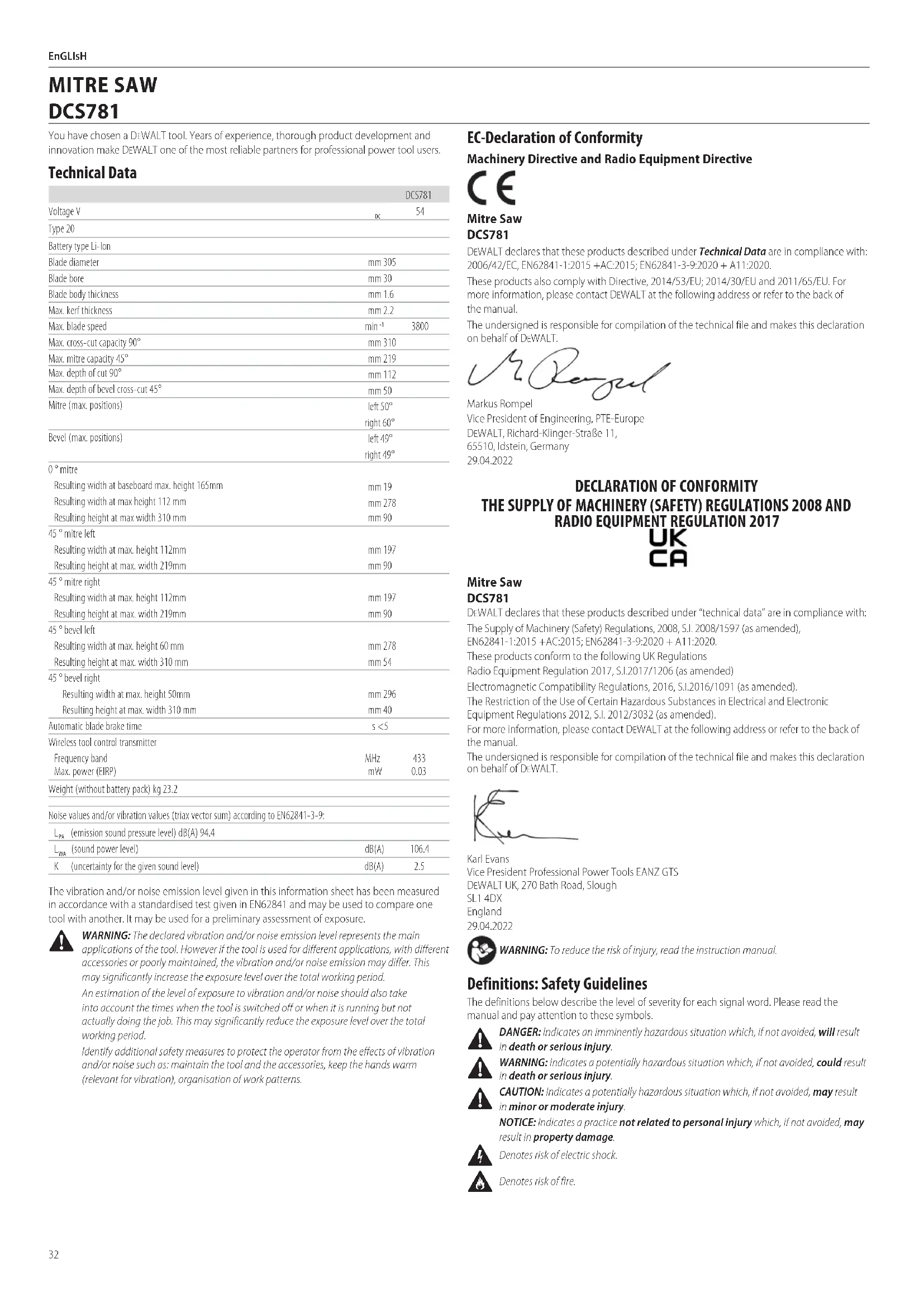 applications of the tool. However if the tool is used for different applications, with different accessories or poorly maintained, the vibration and/or noise emission may differ. This may significantly increase the exposure level over the total workingperiod. An estimation of the level of exposure to vibration and/or noise should also take into account the times when the tool is switched off or when it is running but not actually doing the job. This may significantly reduce the exposure level over the total workingperiod. Identify additional safety measures to protect the operator from the effects of vibration and/or noise such as: maintain the tool and the accessories, keep the hands warm (relevant for vibration), organisation of workpatterns. EC‑Declaration of Conformity Machinery Directive and Radio Equipment Directive Mitre Saw DCS781 DeWALT declares that these products described under Technical Data are in compliance with: 2006/42/EC, EN62841‑1:2015 +AC:2015; EN62841‑3‑9:2020 + A11:2020. These products also comply with Directive, 2014/53/EU; 2014/30/EU and 2011/65/EU. For more information, please contact DeWALT at the following address or refer to the back of themanual. The undersigned is responsible for compilation of the technical file and makes this declaration on behalf ofDeWALT. Markus Rompel Vice President of Engineering, PTE‑Europe DeWALT, Richard‑Klinger‑Straße 11, 65510, Idstein, Germany