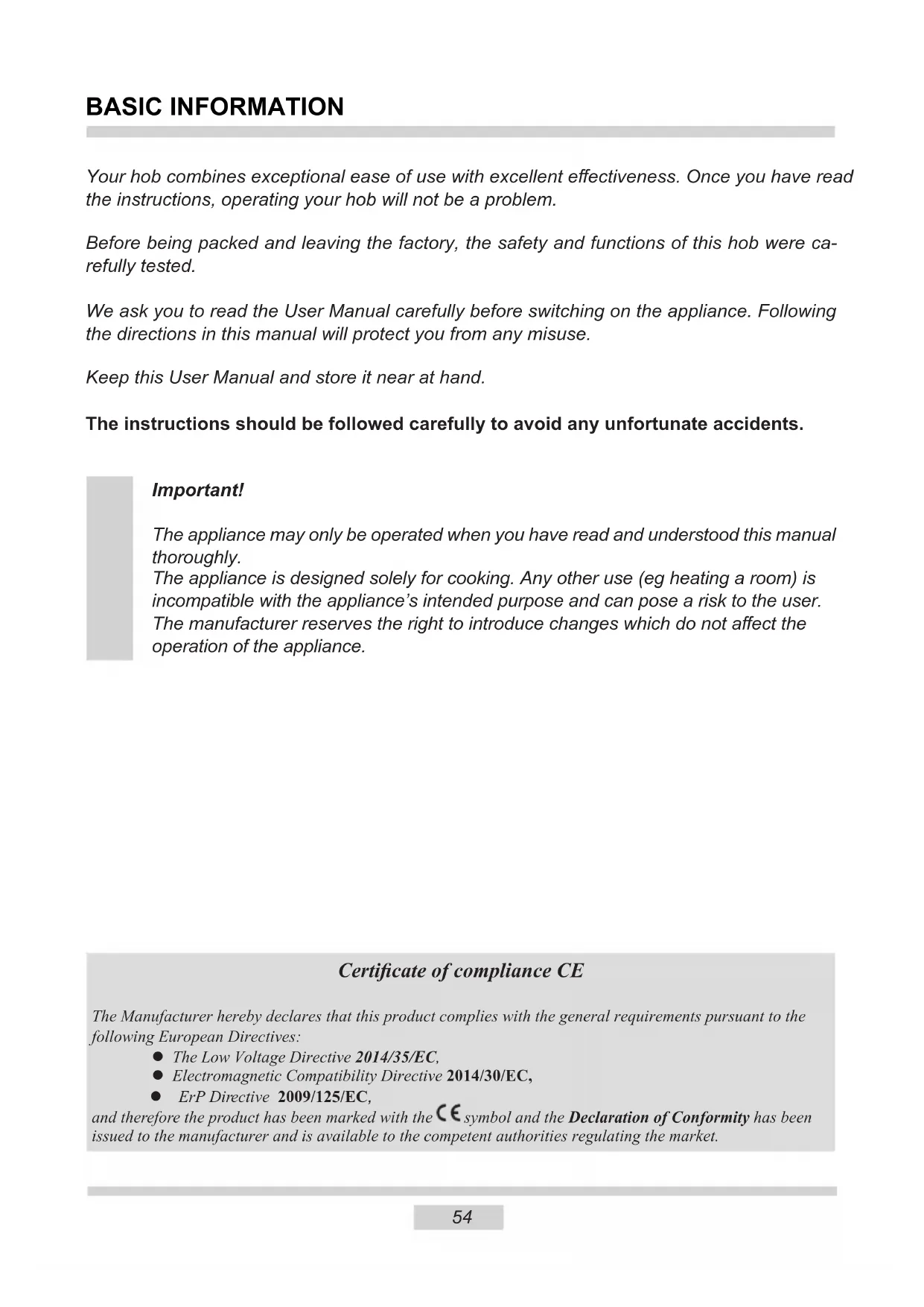 tionne pas, les champs de chauage ne peuvent pas être mis en marche et ne fonctionnent pas. - panne de l’électronique - remettre à zéro la plaque, débrancher la plaque du courant pour quelques minutes (retirer le fusible de l’installation). Tension nominale 220-240V~50/60 Hz Puissance nominale des plaques : 3,7 kW - foyer à induction : - foyer à induction Booster : Ø 160 mm 1200/1400 W - foyer à induction Booster : Ø 210 mm 2000/3000 W Dimensions 300 x 522 x 60;; Poids ca.5,5 kg; Remplit les exigences des normes EN 60335-1; EN 60335-2-6 en vigueur dans l’Union Européenne. DONNEES TECHNIQUES54 Important! The appliance may only be operated when you have read and understood this manual thoroughly. The appliance is designed solely for cooking. Any other use (eg heating a room) is incompatible with the appliance’s intended purpose and can pose a risk to the user. The manufacturer reserves the right to introduce changes which do not aect the operation of the appliance. Certicate of compliance CE The Manufacturer hereby declares that this product complies with the general requirements pursuant to the following European Directives: The Low Voltage Directive 2014/35/EC, Electromagnetic Compatibility Directive 2014/30/EC, ErP Directive 2009/125/EC, and therefore the product has been marked with the symbol and the Declaration of Conformity has been issued to the manufacturer and is available to the competent authorities regulating the market. Your hob combines exceptional ease of use with excellent eectiveness. Once you have read the instructions, operating your hob will not be a problem. Before being packed and leaving the factory, the safety and functions of this hob were ca- refully tested. We ask you to read the User Manual carefully before switching on the appliance. Following the directions in this manual will protect you from any misuse. Keep this User Manual and store it near at hand. The instructions should be followed carefully to avoid any unfortunate accidents. BASIC INFORMATION EN55 Notice. The device and its accessible components become hot when the device is in use. Take special care not to come in contact with heating elements. Children under age of 8 should stay away from the device unless they are under constant supervision Notice. Unsupervised cooking of fat or oil on the hob may be dange- rous and lead to re hazard. NEVER try to extinguish re with water. Instead switch o the device and then smother the ame with, e.g., a lid or re blanket. Notice. Fire hazard: do not keep things on the cooking surface. Notice. Metal items, such as knifes, forks, spoons, lids and tinfoil should not be kept on the hob as they can become hot. Notice. If the surface is cracked, please cut o power supply to avoid the risk of electric shock. This device may only be used by children over age of 8, persons with physical, sensory or mental disabilities,¬ and persons without necessary experience and knowledge only under supervision or when they follow the user’s manual given to them by persons responsible for their safety. Please make sure that children do not play with the device. Cleaning and operating the device should not be performed by unsupervised children. You should not use steam cleaning devices to clean the hob. Notice. When you have nished using the device, switch o the hob with the controller. Do not rely on the indications of the object detector.