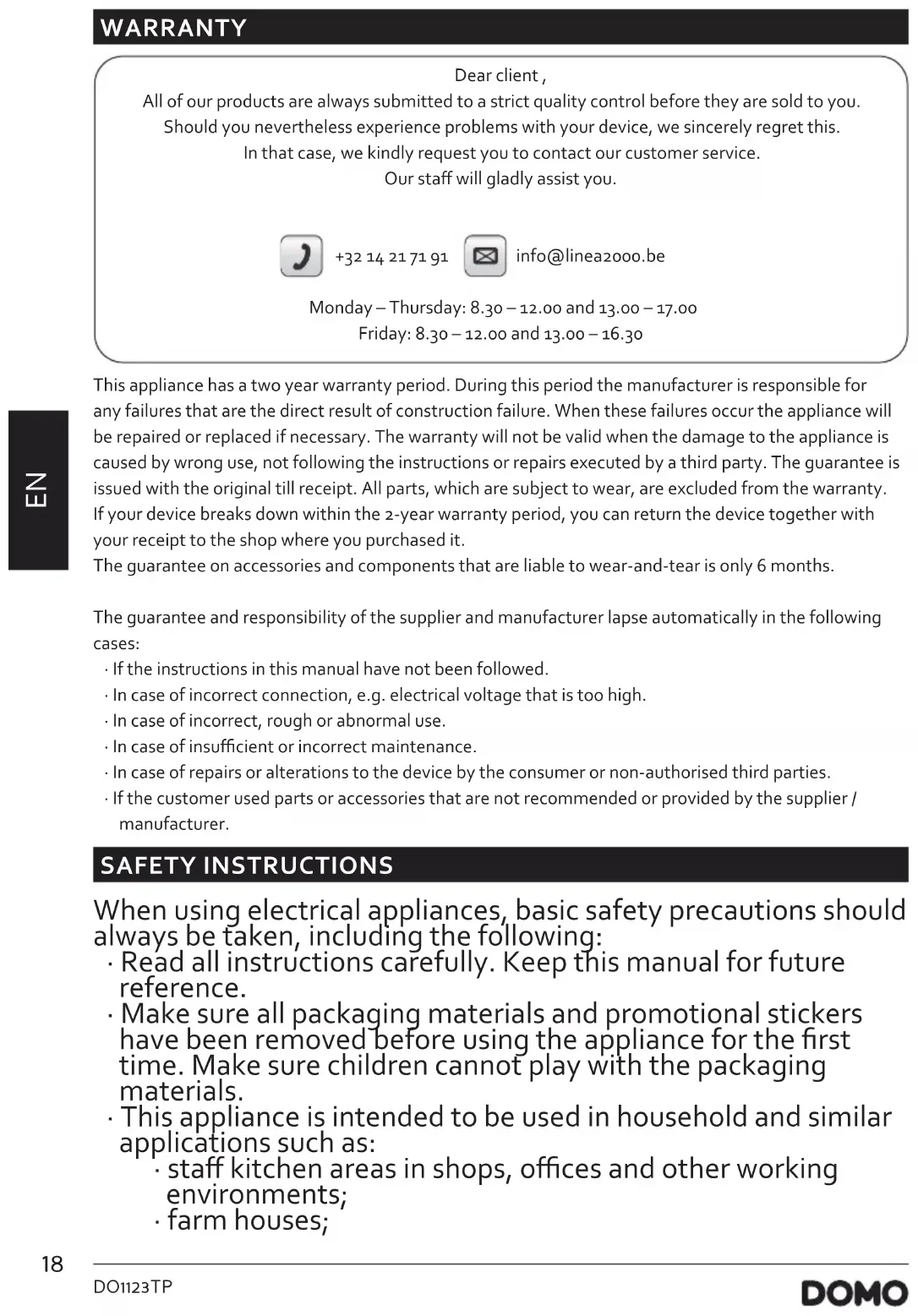 WARRANTY Dear client , All of our products are always submitted to a strict quality control before they are sold to you. Should you nevertheless experience problems with your device, we sincerely regret this. In that case, we kindly request you to contact our customer service. Our sta will gladly assist you. +32 14 21 71 91 info@linea2000.be Monday – Thursday: 8.30 – 12.00 and 13.00 – 17.00 Friday: 8.30 – 12.00 and 13.00 – 16.30 This appliance has a two year warranty period. During this period the manufacturer is responsible for any failures that are the direct result of construction failure. When these failures occur the appliance will be repaired or replaced if necessary. The warranty will not be valid when the damage to the appliance is caused by wrong use, not following the instructions or repairs executed by a third party. The guarantee is issued with the original till receipt. All parts, which are subject to wear, are excluded from the warranty. If your device breaks down within the 2-year warranty period, you can return the device together with your receipt to the shop where you purchased it. The guarantee on accessories and components that are liable to wear-and-tear is only 6 months. The guarantee and responsibility of the supplier and manufacturer lapse automatically in the following cases: