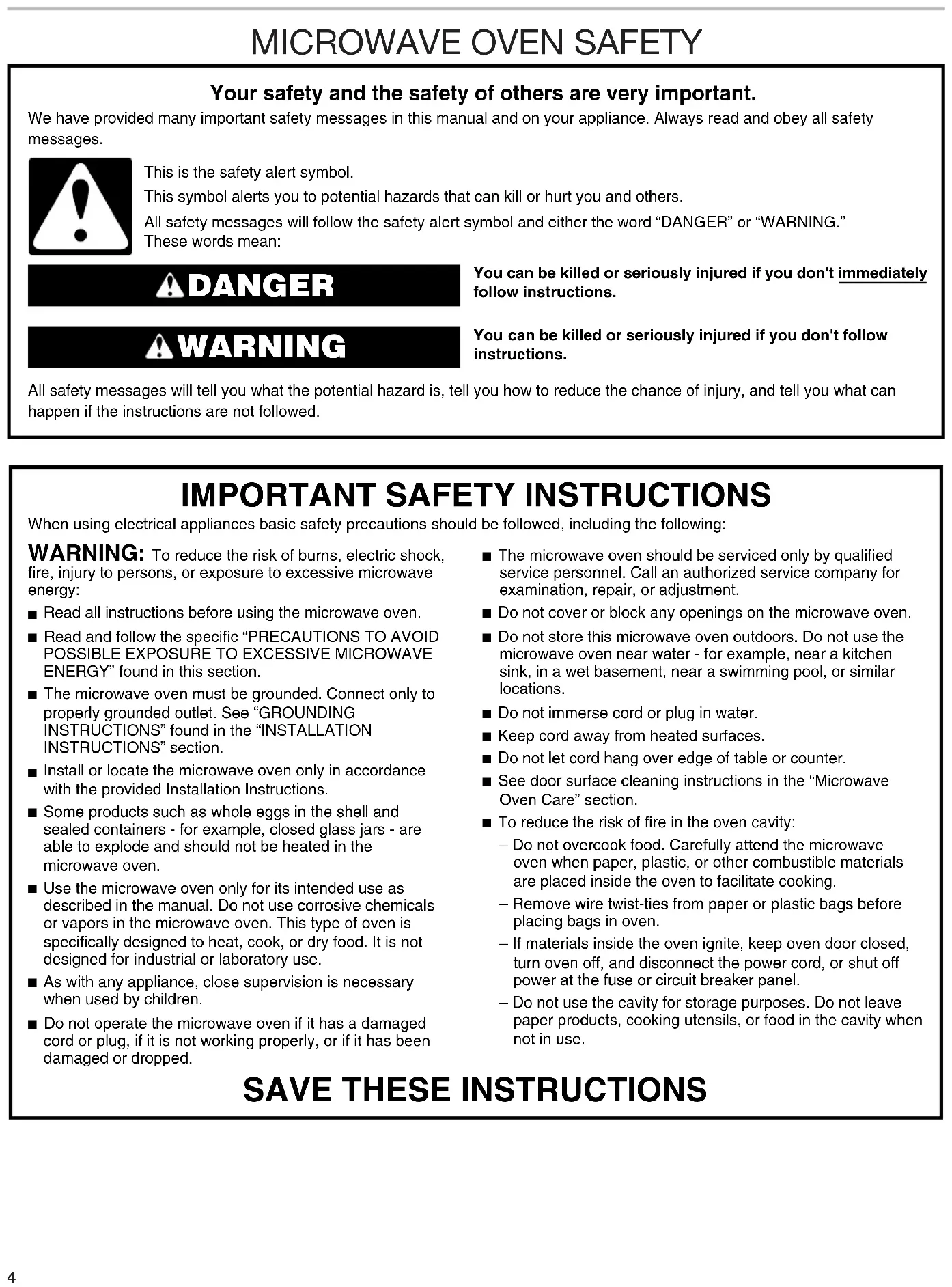 You can be killed or seriously injured if you don't immediately You can be killed or seriously injured if you don'tfollow All safety messages will tell you what the potential hazard is, tell you how to reduce the chance of injury, and tell you what can happen if the instructions are not followed. Your safety and the safety of others are very important. We have provided many important safety messages in this manual and on your appliance. Always read and obey all safety messages.This is the safety alert symbol.This symbol alerts you to potential hazards that can kill or hurt you and others.All safety messages will follow the safety alert symbol and either the word “DANGER” or “WARNING.”These words mean:follow instructions.instructions. DANGER WARNING When using electrical appliances basic safety precautions should be followed, including the following: