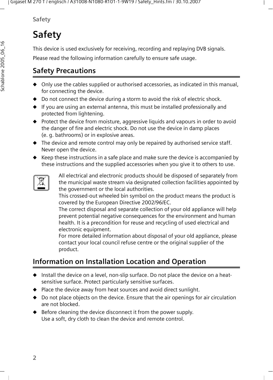 Schablone 2005_06_16 Gigaset M 270 T / englisch / A31008-N1080-R101-1-9W19 / Safety_Hints.fm / 30.10.2007 Safety Safety This device is used exclusively for receiving, recording and replaying DVB signals. Please read the following information carefully to ensure safe usage. Safety Precautions u Only use the cables supplied or authorised accessories, as indicated in this manual, for connecting the device. u Do not connect the device during a storm to avoid the risk of electric shock. u If you are using an external antenna, this must be installed professionally and protected from lightening. u Protect the device from moisture, aggressive liquids and vapours in order to avoid the danger of fire and electric shock. Do not use the device in damp places (e. g. bathrooms) or in explosive areas. u The device and remote control may only be repaired by authorised service staff. Never open the device. u Keep these instructions in a safe place and make sure the device is accompanied by these instructions and the supplied accessories when you give it to others to use. All electrical and electronic products should be disposed of separately from the municipal waste stream via designated collection facilities appointed by the government or the local authorities. This crossed-out wheeled bin symbol on the product means the product is covered by the European Directive 2002/96/EC. The correct disposal and separate collection of your old appliance will help prevent potential negative consequences for the environment and human health. It is a precondition for reuse and recycling of used electrical and electronic equipment. For more detailed information about disposal of your old appliance, please contact your local council refuse centre or the original supplier of the product. Information on Installation Location and Operation u Install the device on a level, non-slip surface. Do not place the device on a heat- sensitive surface. Protect particularly sensitive surfaces. u Place the device away from heat sources and avoid direct sunlight. u Do not place objects on the device. Ensure that the air openings for air circulation are not blocked. u Before cleaning the device disconnect it from the power supply. Use a soft, dry cloth to clean the device and remote control.