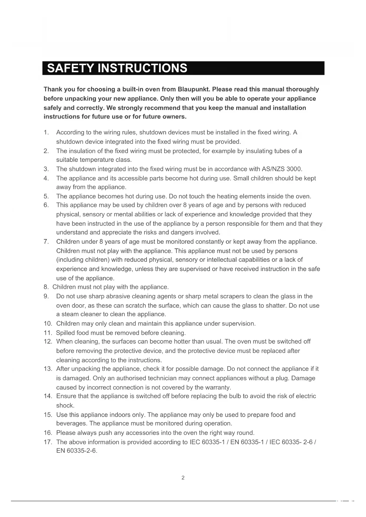 SAFETY INSTRUCTIONS Thank you for choosing a built-in oven from Blaupunkt. Please read this manual thoroughly before unpacking your new appliance. Only then will you be able to operate your appliance safely and correctly. We strongly recommend that you keep the manual and installation instructions for future use or for future owners.