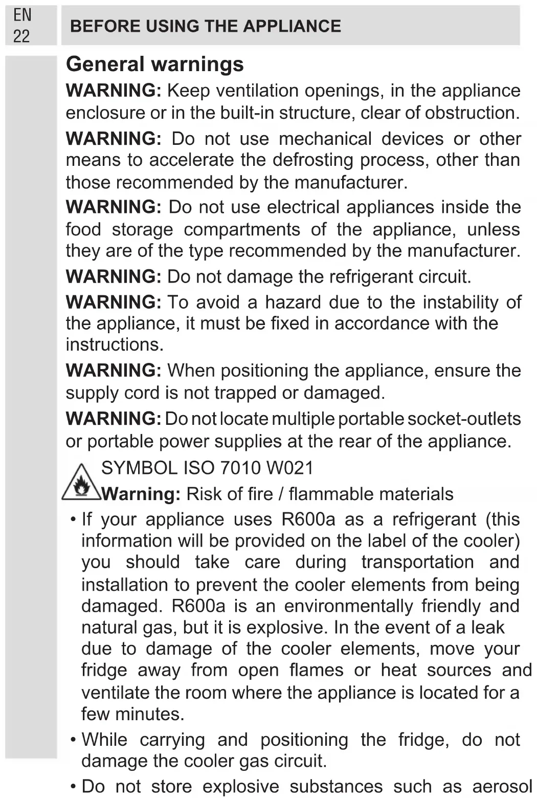 - If your appliance uses R600a as a refrigerant (this information will be provided on the label of the cooler) you should take care during transportation and installation to prevent the cooler elements from being damaged. R600a is an environmentally friendly and natural gas, but it is explosive. In the event of a leak due to damage of the cooler elements, move your fridge away from open ames or heat sources and ventilate the room where the appliance is located for a few minutes.