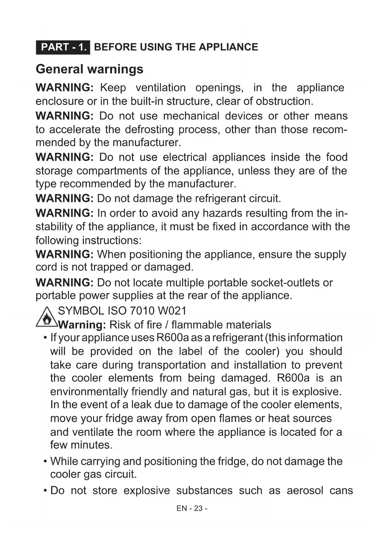 - If your appliance uses R600a as a refrigerant (this information will be provided on the label of the cooler) you should take care during transportation and installation to prevent the cooler elements from being damaged. R600a is an environmentally friendly and natural gas, but it is explosive. In the event of a leak due to damage of the cooler elements, move your fridge away from open ames or heat sources and ventilate the room where the appliance is located for a few minutes.