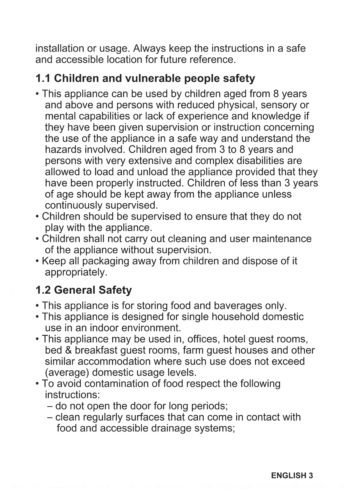 - To avoid contamination of food respect the following instructions: – do not open the door for long periods; – clean regularly surfaces that can come in contact with food and accessible drainage systems; ENGLISH 3– store raw meat and fish in suitable containers in the refrigerator, so that it is not in contact with or drip onto other food.