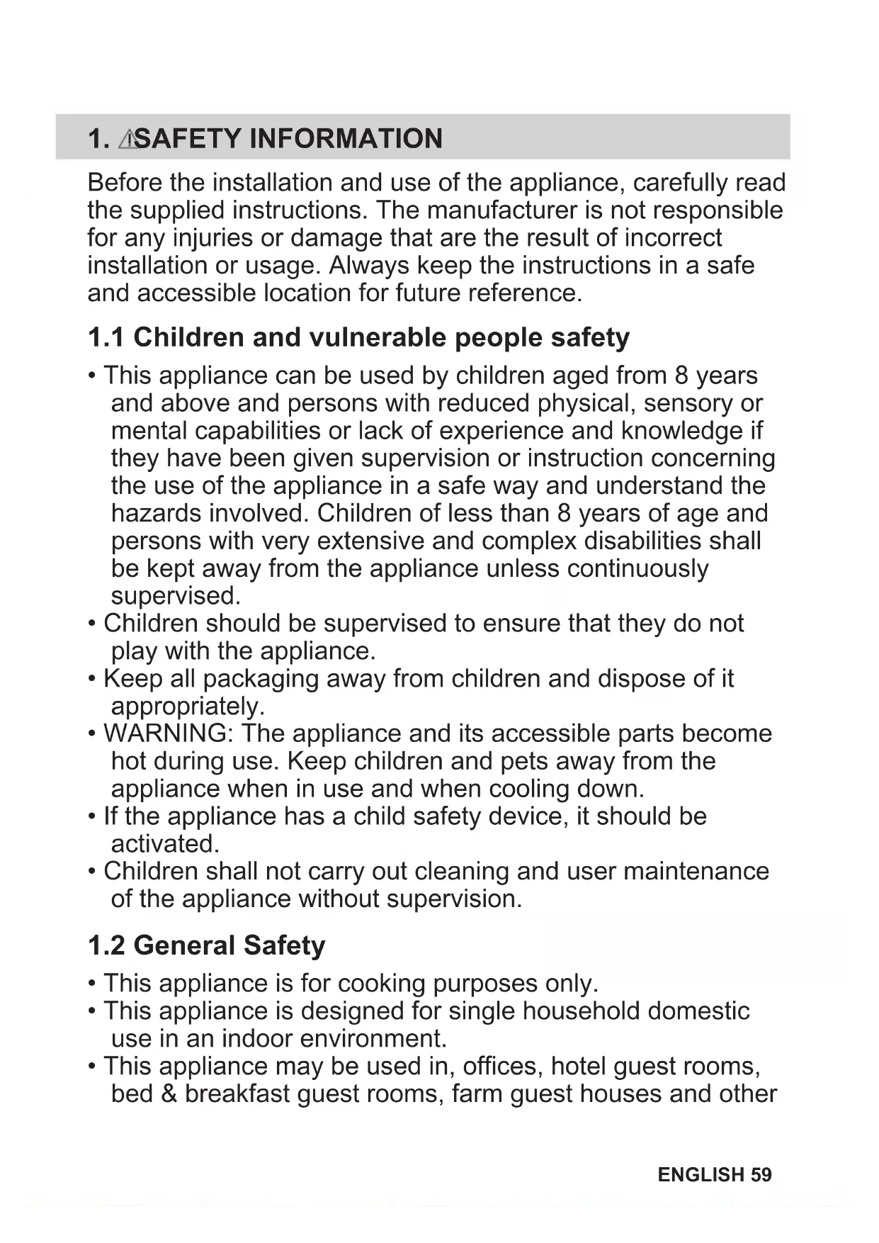 - This appliance can be used by children aged from 8 years and above and persons with reduced physical, sensory or mental capabilities or lack of experience and knowledge if they have been given supervision or instruction concerning the use of the appliance in a safe way and understand the hazards involved. Children of less than 8 years of age and persons with very extensive and complex disabilities shall be kept away from the appliance unless continuously supervised.