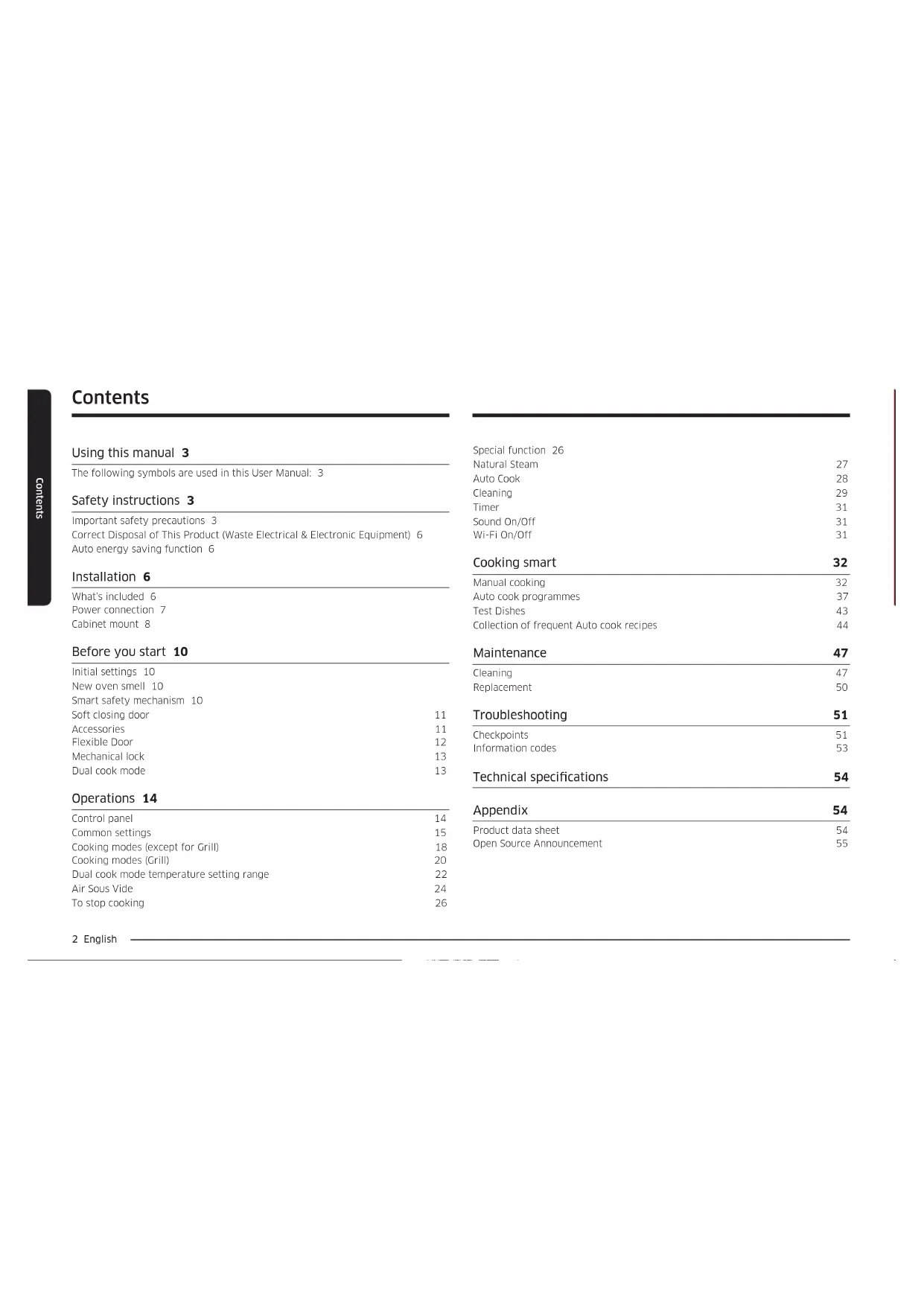 Product data sheet 54 Open Source Announcement 55English 3 Using this manual Safety instructions Installation of this oven must be performed only by a licensed electrician. The installer is responsible for connecting the appliance to the mains power supply in observance of the relevant safety recommendations. Important safety precautions WARNING This appliance is not intended for use by persons (including children) with reduced physical, sensory or mental capabilities, or lack of experience and knowledge, unless they have been given supervision or instruction concerning use of the appliance by a person responsible for their safety. Children should be supervised to ensure that they do not play with the appliance. The means for disconnection must be incorporated in the xed wiring in accordance with the wiring rules. This Appliance should be allowed to disconnection from the supply after installation. The disconnection may be achieved by having the plug accessible or by incorporating a switch in the xed wiring in accordance with the wiring rules. If the supply cord is damaged, it must be replaced by the manufacturer, its service agent or similarly qualied persons in order to avoid a hazard. Using this manual Thank you for choosing SAMSUNG Built-In Oven. This User Manual contains important information on safety and instructions intended to assist you in the operation and maintenance of your appliance. Please take the time to read this User Manual before using your oven and keep this book for future reference. The following symbols are used in this User Manual: WARNING Hazards or unsafe practices that may result in severe personal injury, death and/ or property damage. CAUTION Hazards or unsafe practices that may result in personal injury and/or property damage. NOTE Useful tips, recommendations, or information that helps users manipulate the product.4 English Safety instructions Safety instructions The method of xing stated is not to depend on the use of adhesives since they are not considered to be a reliable xing means. This appliance can be used by children aged from 8 years and above and persons with reduced physical, sensory or mental capabilities or lack of experience and knowledge if they have been given supervision or instruction concerning use of the appliance in a safe way and understand the hazards involved. Children shall not play with the appliance. Cleaning and user maintenance shall not be made by children without supervision. Keep the appliance and its cord out of reach of children less than 8 years. During use the appliance becomes hot. Care should be taken to avoid touching heating elements inside the oven.